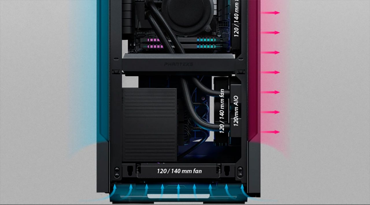 К сожалению, хотя на боковой стенке можно разместить пару 120/140-мм пропеллеров, радиатор СЖО типоразмера 240/280-мм не поместится. Вот это прямо косяк. Инженеры Phanteks глупо поступили, разместив между посадочными местами вентиляторов ребро жёсткости.