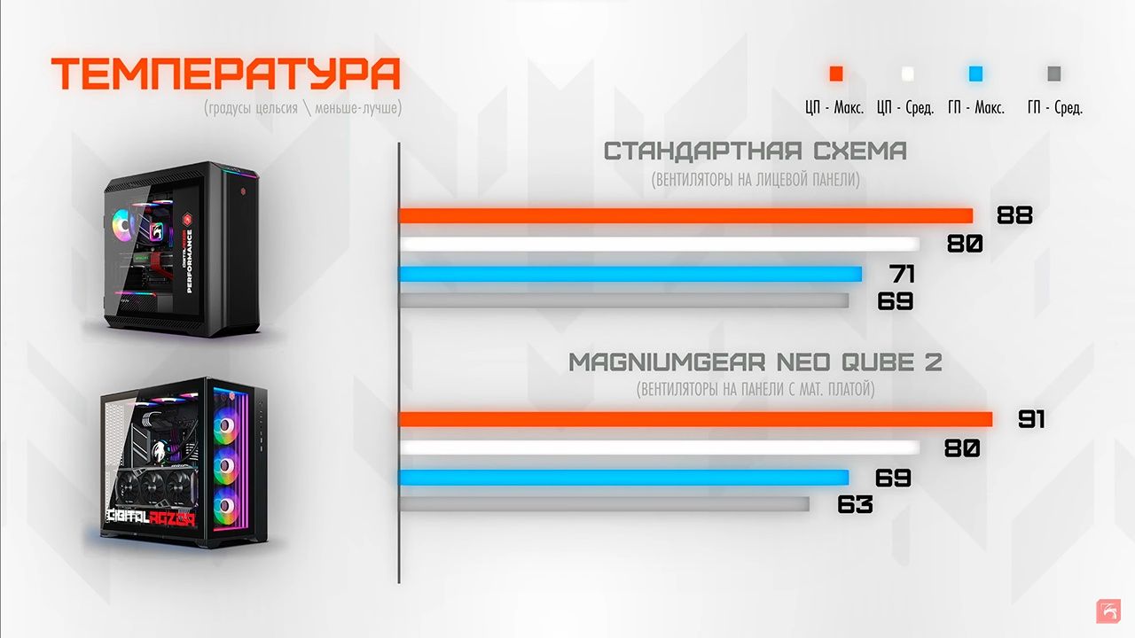 Выбор расположения зависит вкуса. Вниз, конечно, не рекомендуем. За установку рядом с мат. платой переживать не стоит. Есть классическая схема создания воздухопотока в корпусе, но и в данном варианте проблем нет, вот тесты на примерах нескольких наших сборок.