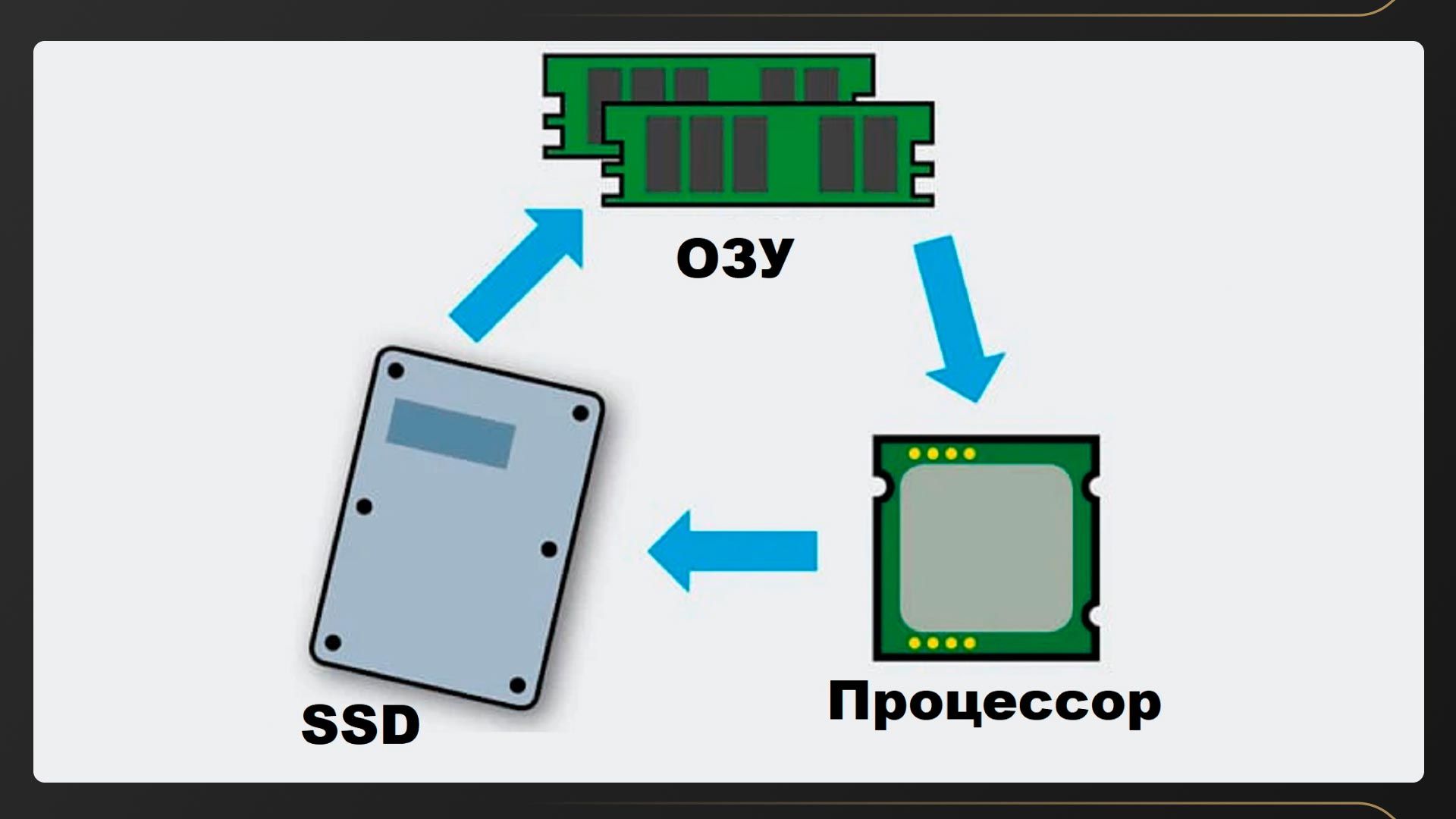 У жёсткого диска памяти больше, но с него данные загружаются долго. А собственная память у процессора очень мала. Даже у самых продвинутых моделей она насчитывает лишь десятки мегабайт. Именно поэтому для ОЗУ важно не только, как много информации он может содержать, но и как быстро она передаётся процессору.