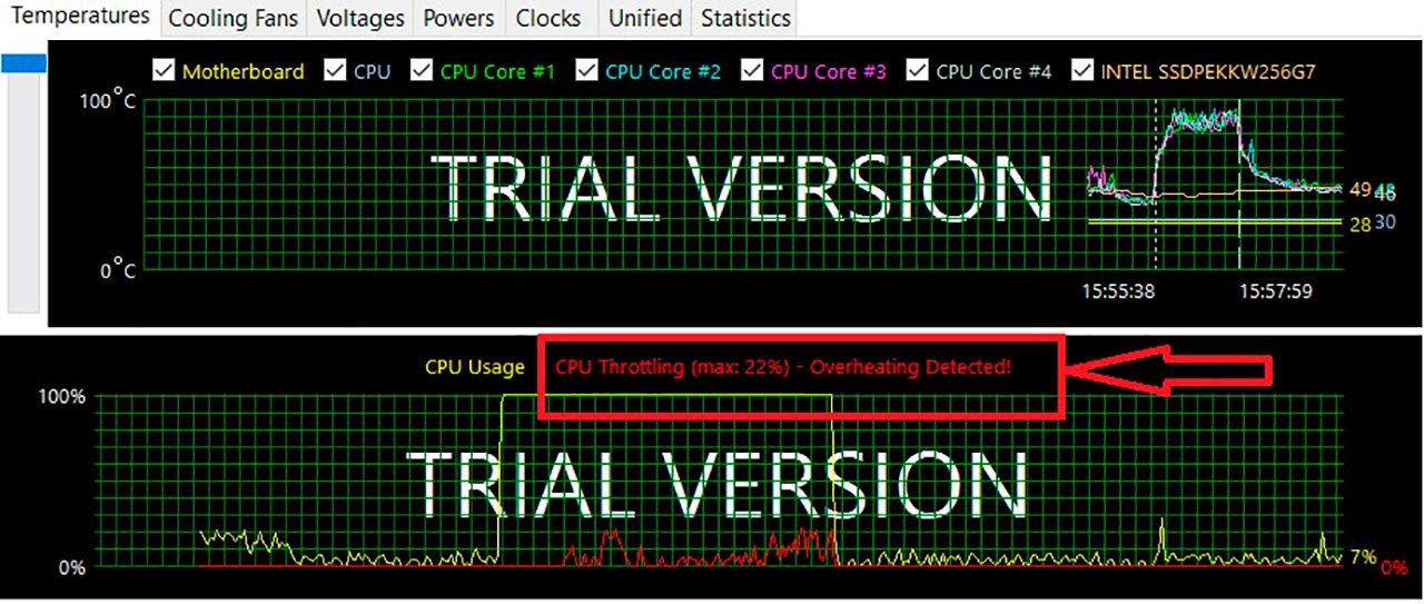 Если ПК перегреется и механизм защиты включится — вы не пропустите. Это будет видно по графику температуры и красной надписи «CPU Throttling — Overheating Detected!». Нижний график покажет частоту процессора, то есть насколько сильно процессор троттлит;