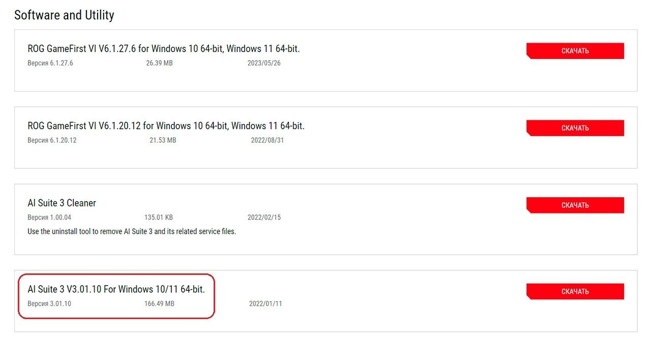 В случае материнской платы ASUS потребуется утилита AI Suite 3. Скачать её можно на странице поддержки конкретной модели платы в разделе «Драйверы и Утилиты». Частенько она спрятана в подразделе «Software and Utility». Объём утилиты в районе 166 МБ, не стоит путать с AI Suite 3 Cleaner объёмом всего 135 КБ.