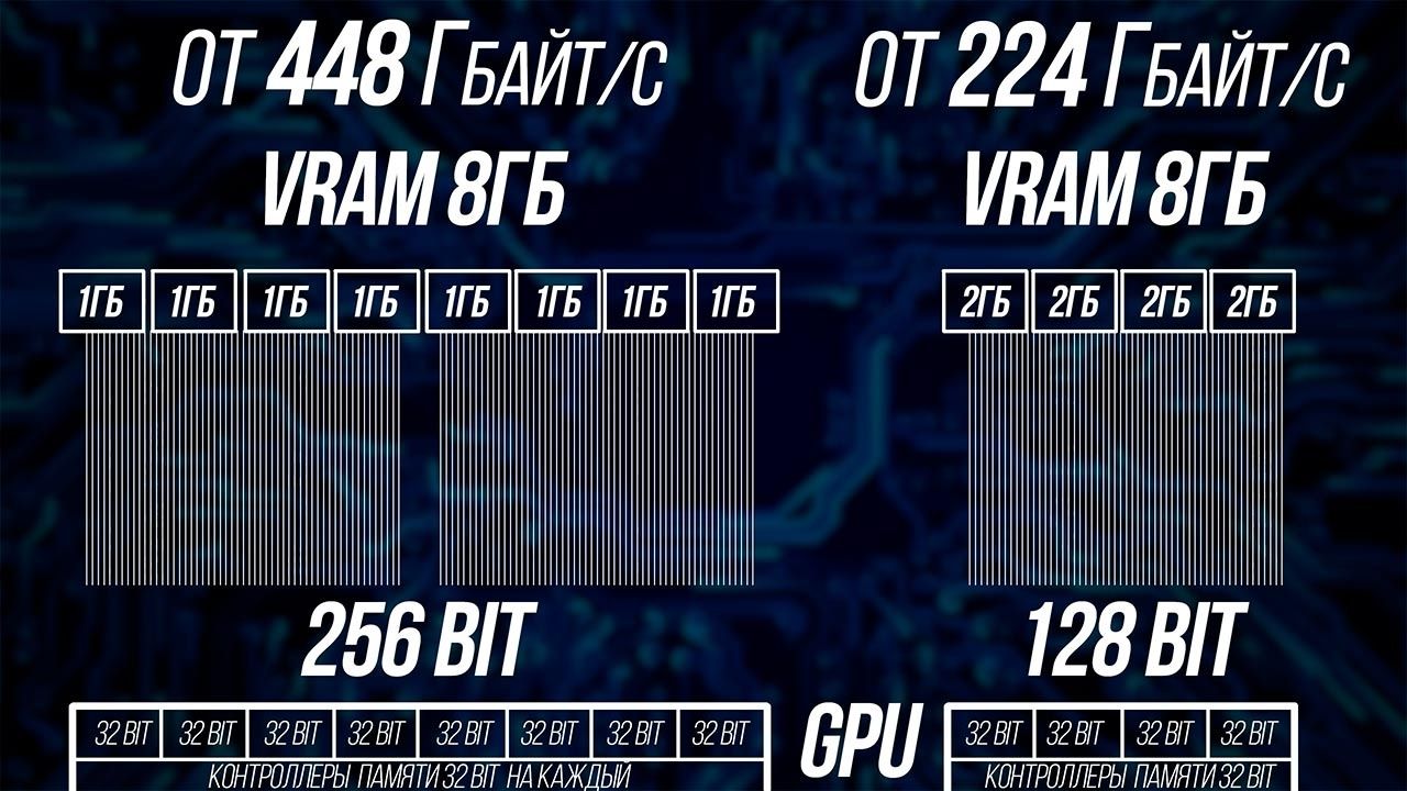 Графический чип соединён дорожками с каждым чипом памяти. Вне зависимости от типа/поколения памяти (кроме HBM) максимум таких дорожек может быть 32. С ответной стороны контроллеры памяти в составе GPU. Всё вместе – разрядность/битность шины.