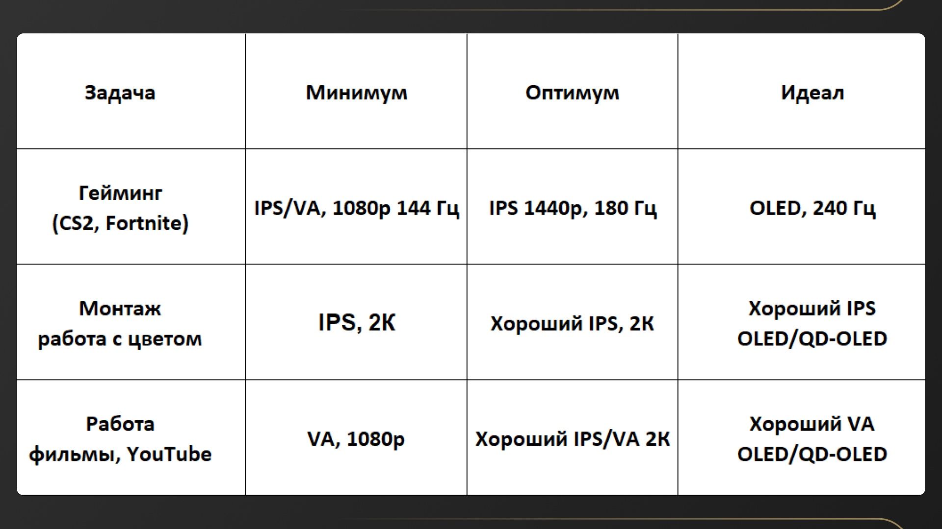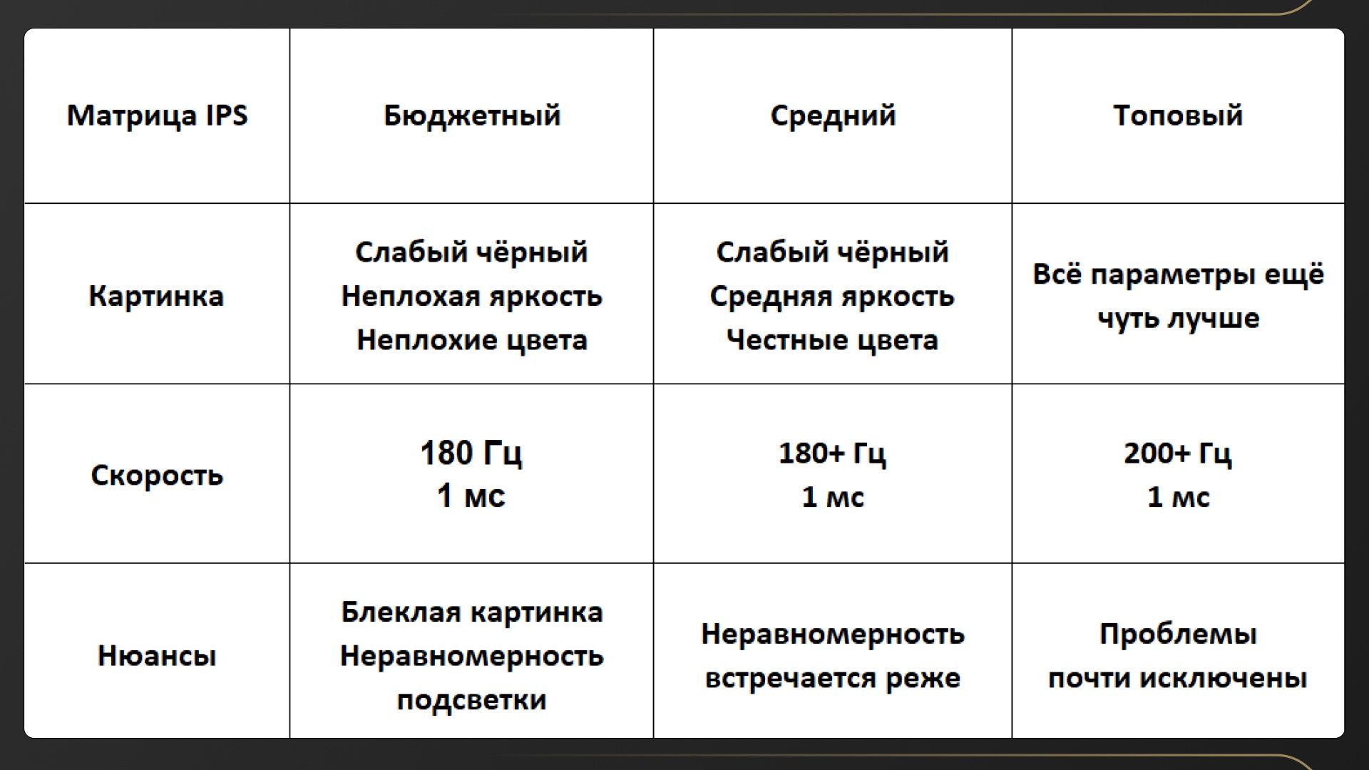IPS-матрицы бывают разные. Существуют сверхскоростные варианты, профессиональные с точным и правильным цветом, а также универсальные с усреднёнными параметрами. IPS подойдёт всем, но стоит сделать скидку на чёрный цвет. Он не так хорош, как у VA.