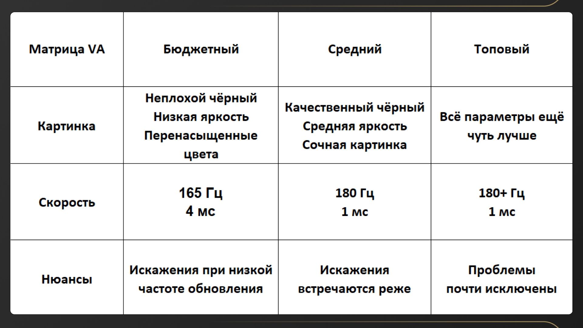 VA обеспечит более насыщенный чёрный цвет и сочную картинку, но возможны нюансы при низкой частоте обновления.