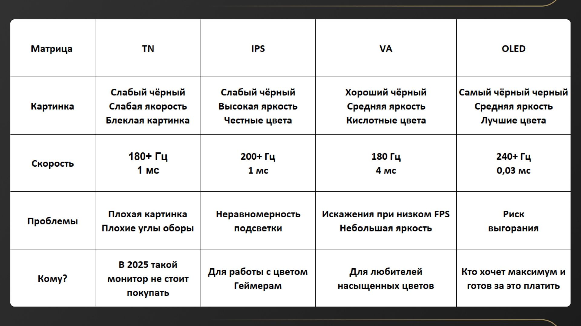 OLED предлагает лучшее качество изображения по всем параметрам. Если между хорошими IPS и VA разница небольшая, то любая OLED на голову лучше почти любой IPS и VA. Отлично подойдёт под любые задачи. Однако, для работы это опасный выбор из-за риска выгорания. Эта матрица сильно не любит статичное изображение, вроде интерфейса программы.