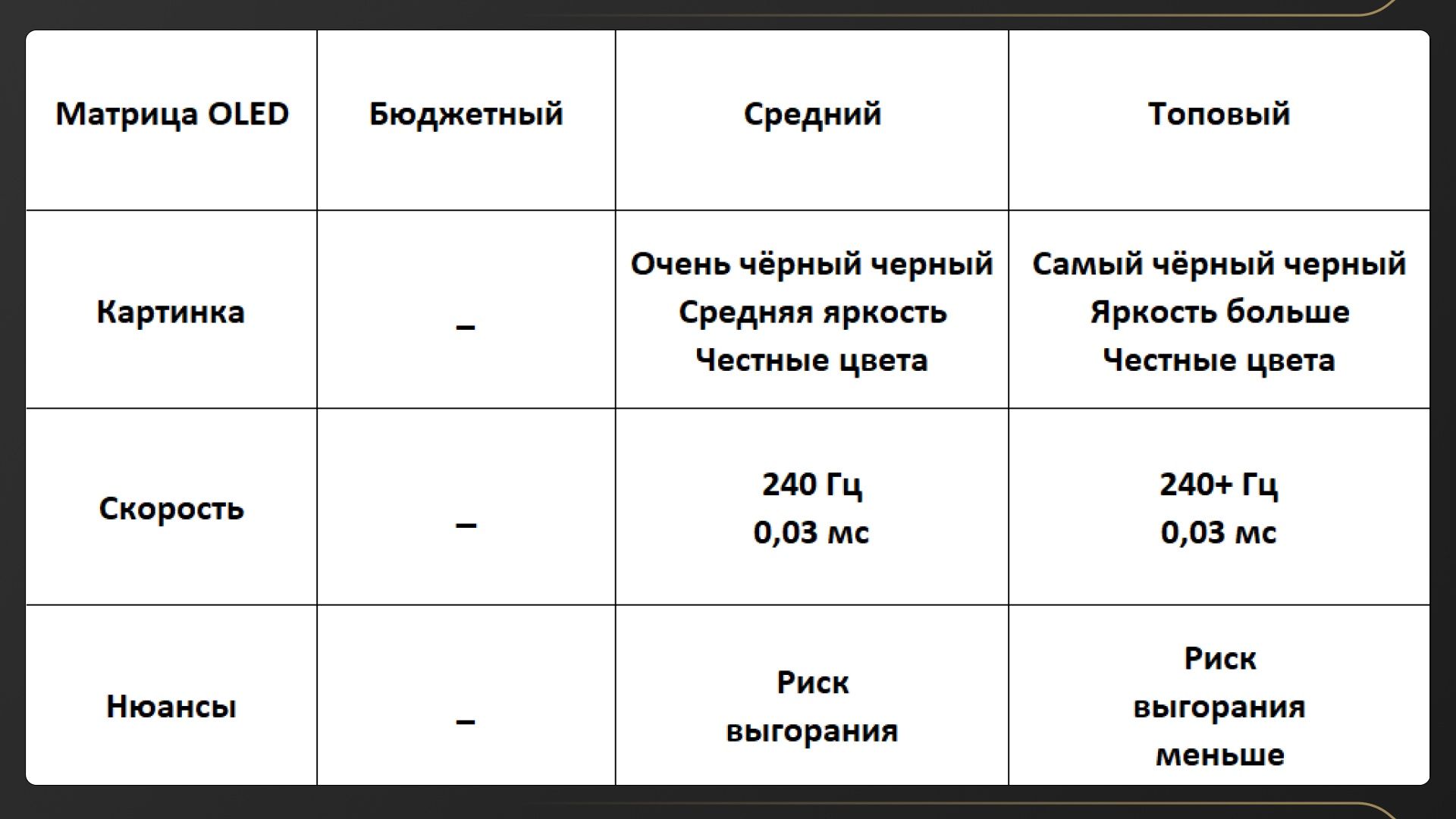 OLED — несопоставимо хорошая матрица в плане картинки и насыщенности чёрного, но дорогая и с риском выгорания.