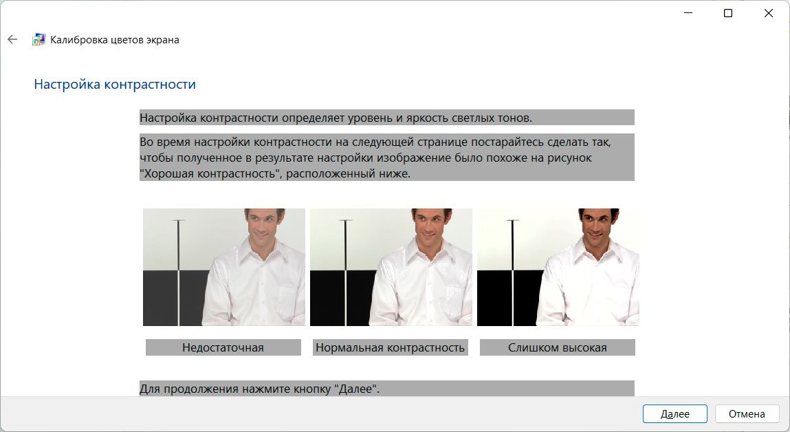Переходим к яркости. Советуем НЕ «Пропускать регулировку яркости и контрастности». Попробуйте их настроить, для этого жмите «Далее»;