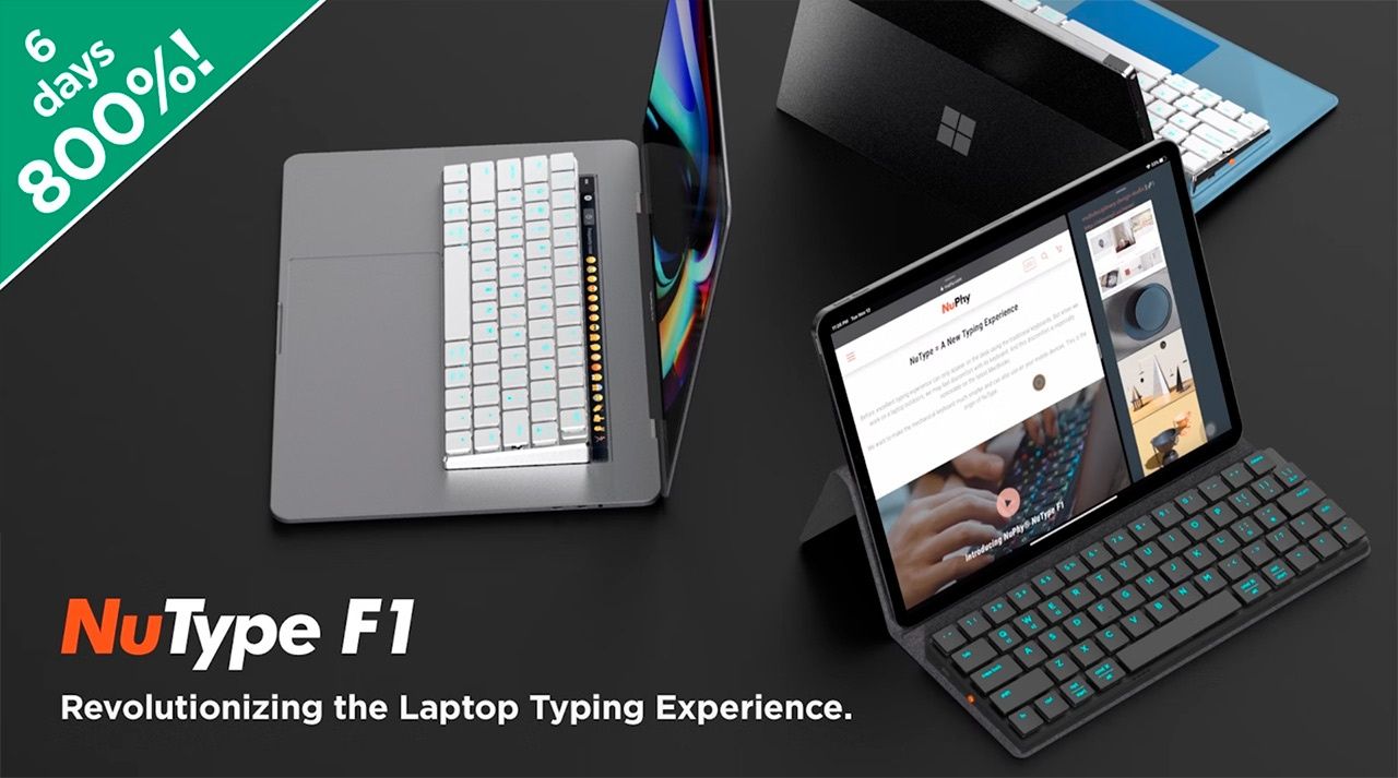 А при чём здесь NuPhy? Предприимчивый владелец компании увидел свободную нишу. С помощью краундфандинга на Kickstarter удалось собрать $166 тыс для выпуска NuType F1. Это накладная беспроводная клавиатура, которая идеально помещалась в посадку MacBook и становилась на место «родной» проблемной клавиатуры. Естественно, ноутбук больше не закрывался, зато можно было пользоваться трекпадом и сенсорной панелью над «клавой». Выглядит как настоящая дичь, но владельцам Apple не привыкать сначала получать проблемы, а потом их героически преодолевать.