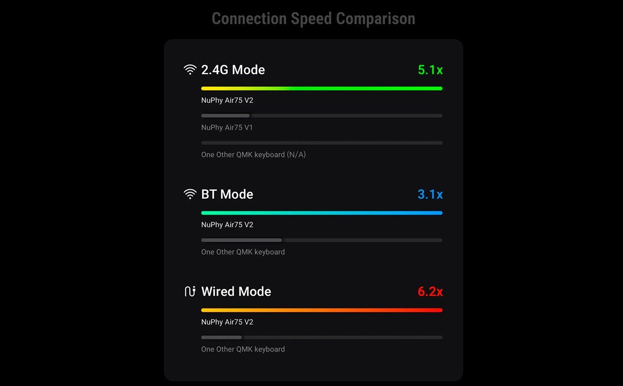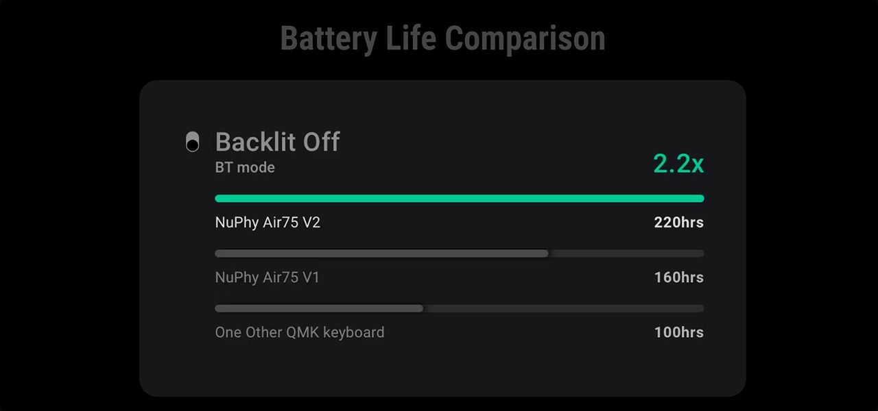 На официальной странице NuPhy в режиме Bluetooth сравнивает Air75 V1 с батареей на 2500 мА*ч с Air75 V2, где 4000 мА*ч. И действительно, автономность сильно отличается. Если обе клавиатуры подключат по Wi-Fi, разницы не будет ровно никакой, ведь у V1 по 2,4 ГГц частота 500 МГц, а у V2 – 1000 Гц. В итоге то на то и выходит. Ну и напомним, что показатель ёмкости в отрыве от рабочего напряжения не значит вообще ничего.