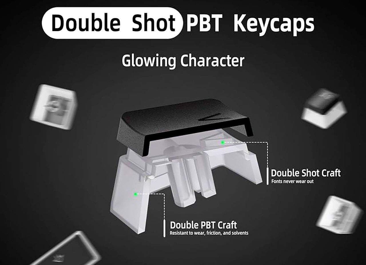 Колпачки клавиш низкопрофильного типа, выполнены из PBT-пластика по технологии Double-Shot. Грубо говоря, это один колпачок поверх другого. Главный плюс этого подхода в том, что нижняя часть полупрозрачная, а верхняя непрозрачная. Гравировка символов прорезает только верхний слой. Как итог «стереться» гравировка просто не может, к тому же пластик типа PBT очень стойкий.