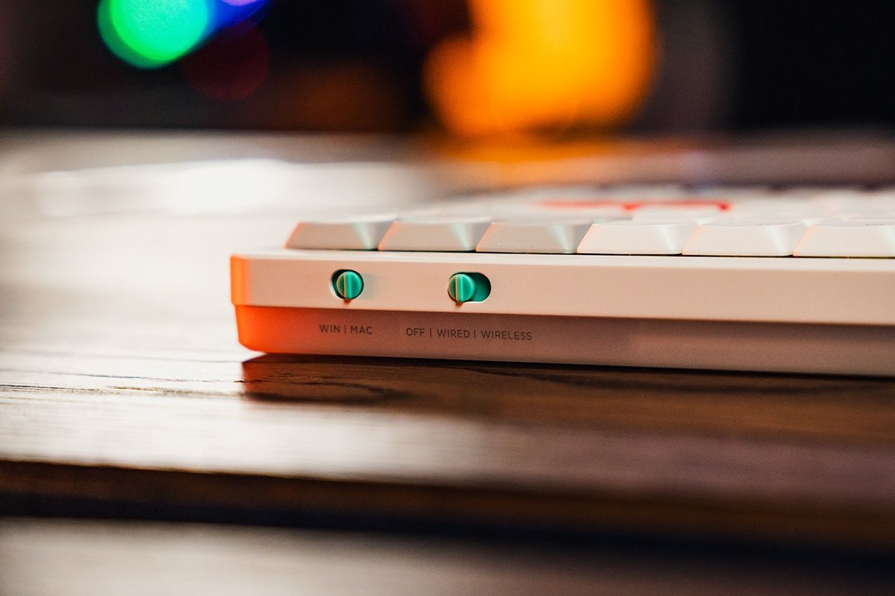 Однако, есть переключатели на левом-верхнем торце. Один двухпозиционный (выбор между работой с Windows и MacOS), второй трёхпозиционный (выключено, работа по кабелю, работа в беспроводном режиме). USB-C для зарядки расположен на другой стороне этой панели.