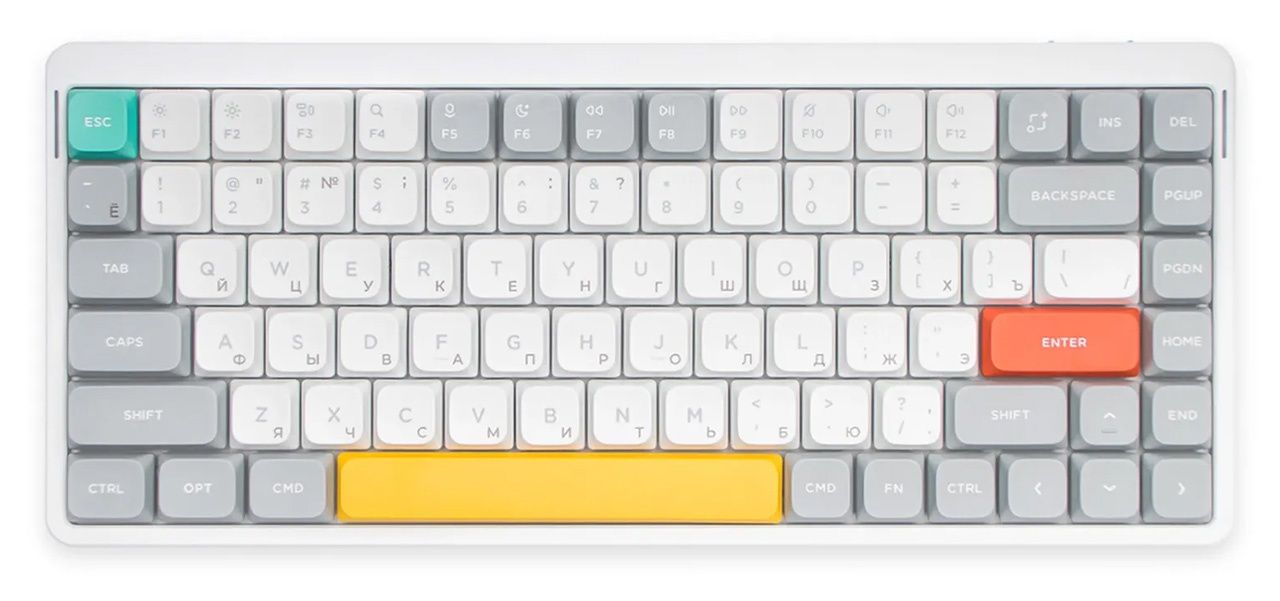 Изначально NuPhy Air75 V2 поставляется с «эпловской» раскладкой. По сути, вся разница сводится к клавишам «OPT» и «CMD» вместо привычных «Win» и «ALT». Для их замены в комплекте и поставляются сменные колпачки, ну а прочие для небольшой стилизации под себя.