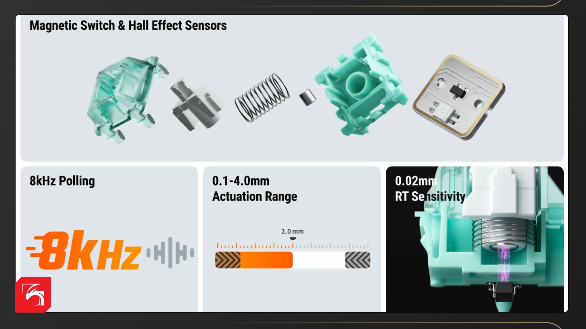 У этих же свитчей в кнопке находится маленький магнит, а на плате специальный датчик. Он фиксирует изменение магнитного поля при нажатии, при этом тактильный отклик такой же, как у классической механики. У этой технологии есть несколько плюсов: