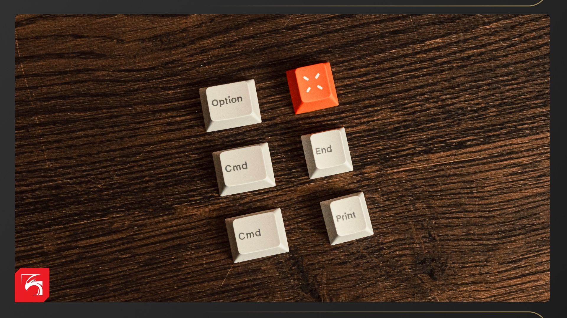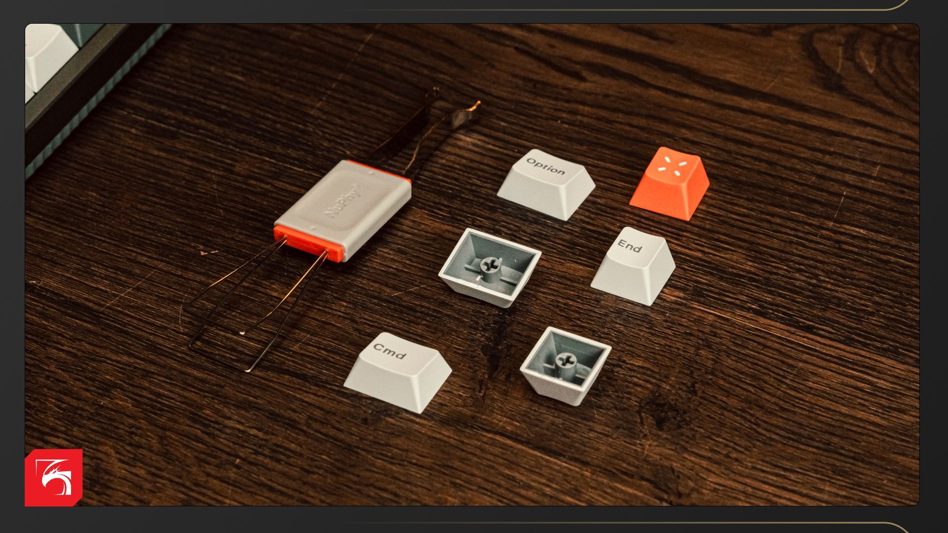 - Набор из шести дополнительных кейкапов. Сделаны они точно так же, но другая гравировка. Пригодятся для перехода на «эпловскую» раскладку, а также для изменения функций некоторых кнопок. К примеру, если Page UP/Down не нужны, на них можно задать функции PrtScreen/End и поставить подходящие колпачки.