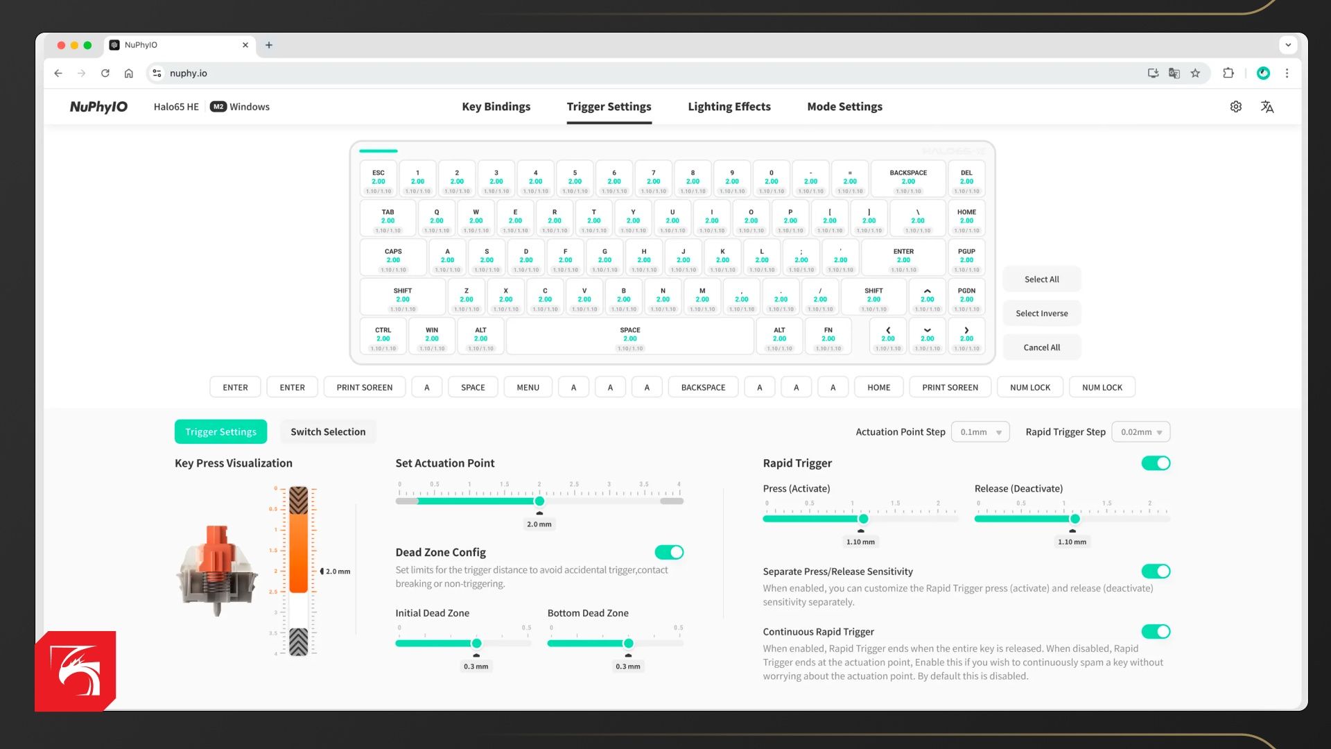 Функциональность ПО в целом повторяет любого другого производителя. Есть программирование клавиш, запись макросов, управление подсветкой для трёх профилей. Есть так называемые «слои». Это когда меняется назначение клавиш, если зажать условный правый Alt. Из необычного раздел Tigger Settins. Здесь можно задать параметры тех самых магнитных переключателей.