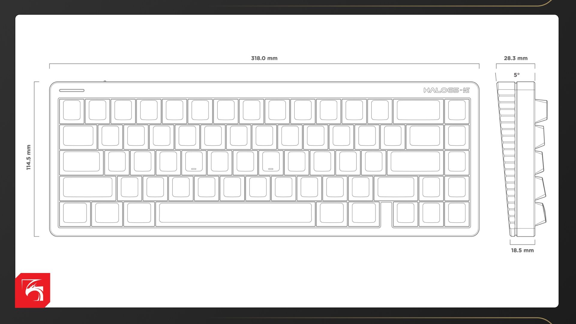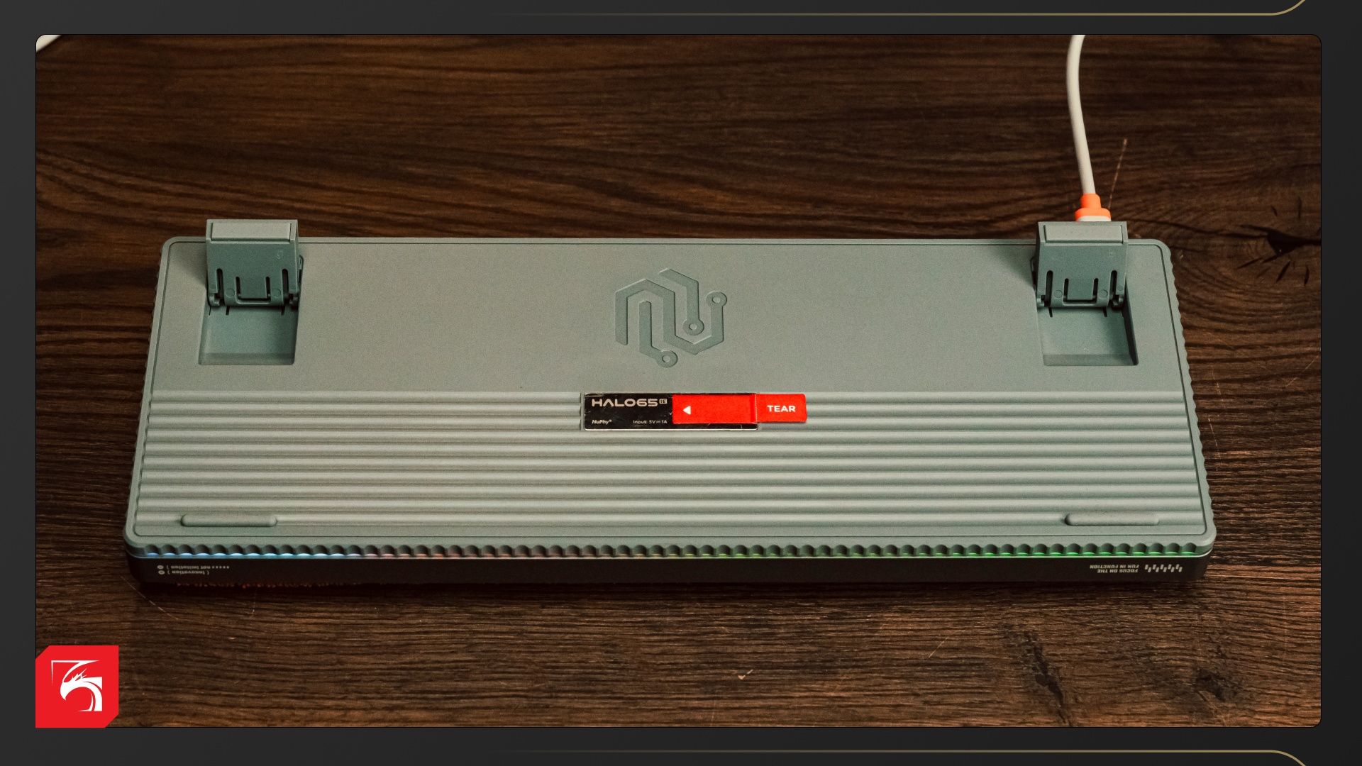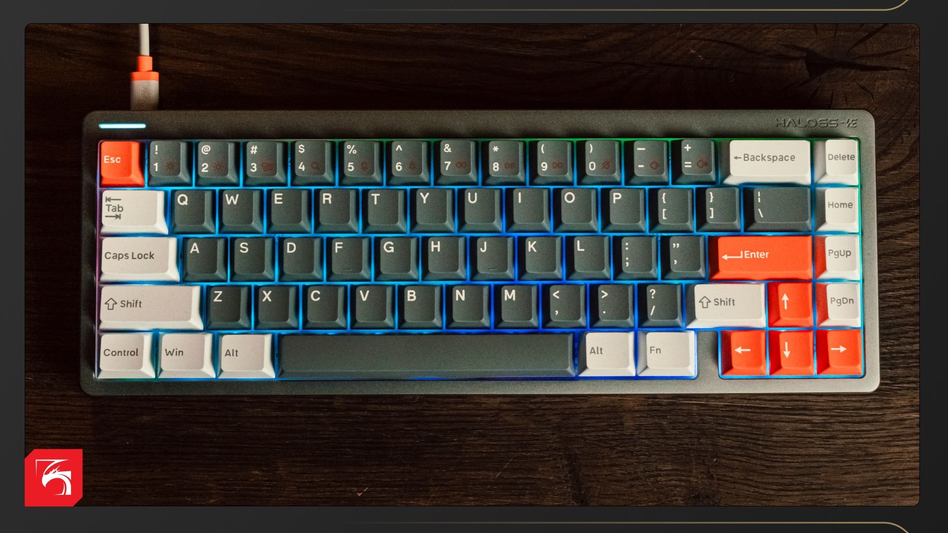 Внешне Halo 65 HE выглядит почти классически. Это не популярный сейчас тип «скелетон», где клавиши как бы парят над основанием, а стандартная клавиатура с бортиками. Верхняя панель выполнена из шлифованного алюминия, нижняя — пластиковая. Между ними по всему периметру проходит тонкая-стильная полосочка RGB-подсветки