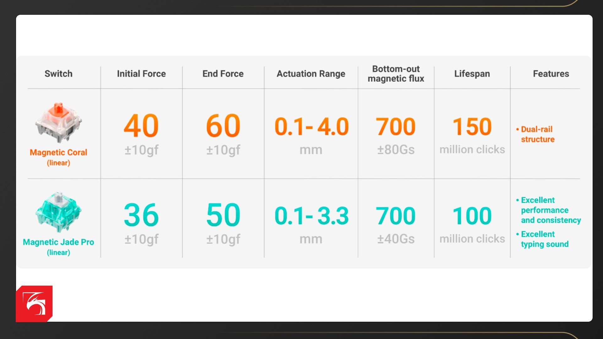 Есть две версии переключателей — Coral и Jade Pro. По характеристикам они близки, но Coral более жёсткие (60 грамм против 50), максимальный ход больше, а заявленный ресурс меньше. У нас на обзоре версия на Jade Pro. Сравнить как кликают клавиши можно в видео.