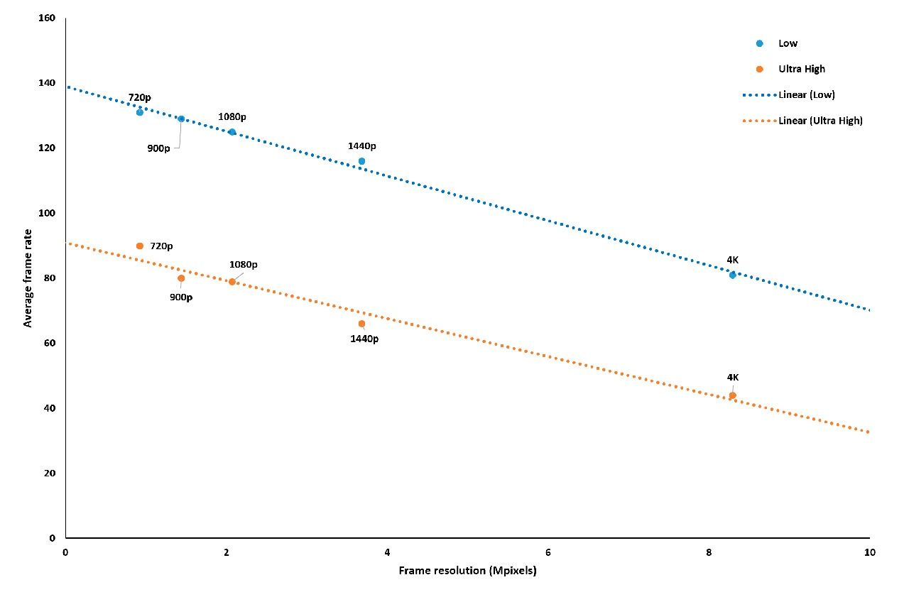 Использовалось разрешение 1080p (1920x1080 пикселей) и качество графики Ultra High. Всего сделано 5 прогонов. Время обработки кадров было усреднено, затем преобразовано в частоту кадров (fps) и, наконец, отображено на графике.