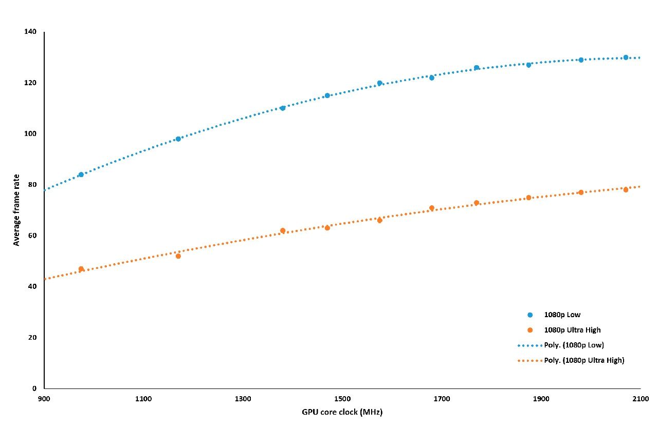 Как выяснить, какая именно ситуация в данном случае? Для этого нужно изменить всего одну переменную – тактовую частоту ядра GPU. Вот результаты нескольких тестов при разрешении 1080р в широком диапазоне частот.