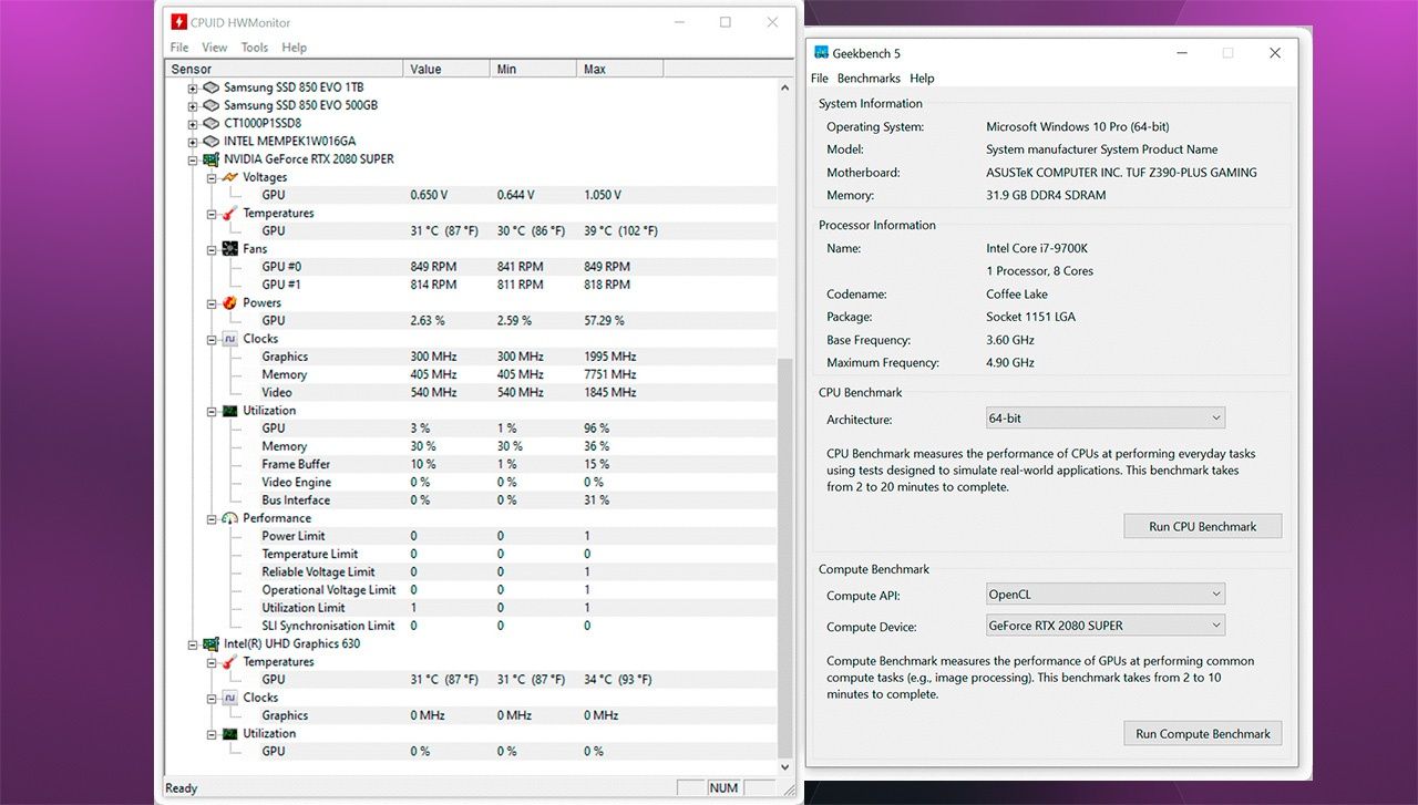 В этом можно убедиться, запустив пару разных бенчмарков, и записав данные с помощью HWMonitor. Первый тест – Geekbench 5, в котором все вычислительные процедуры выполняются на видеокарте.