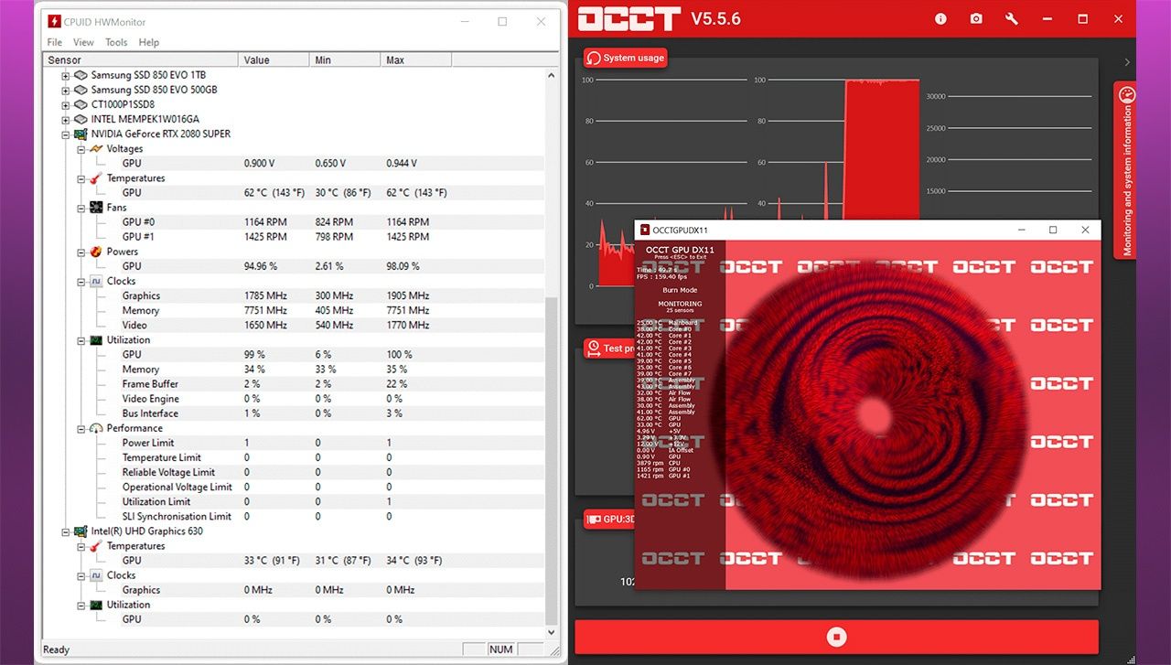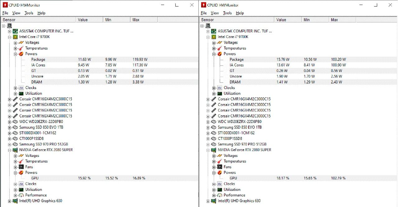 Если посмотреть на колонку «Max» в HWMonitor, то заметно, что максимальная загрузка видеокарты составила 96%. При этом фактически видеокарта потребляла чуть более половины лимита мощности – 57,3%, что для RTX 2080 Super порядка 140 Вт из 250 Вт возможных. Также стоит заметить, что температура видеоядра поднялась всего на 9 градусов выше минимального значения – слишком мало для прилично нагруженной видеокарты.