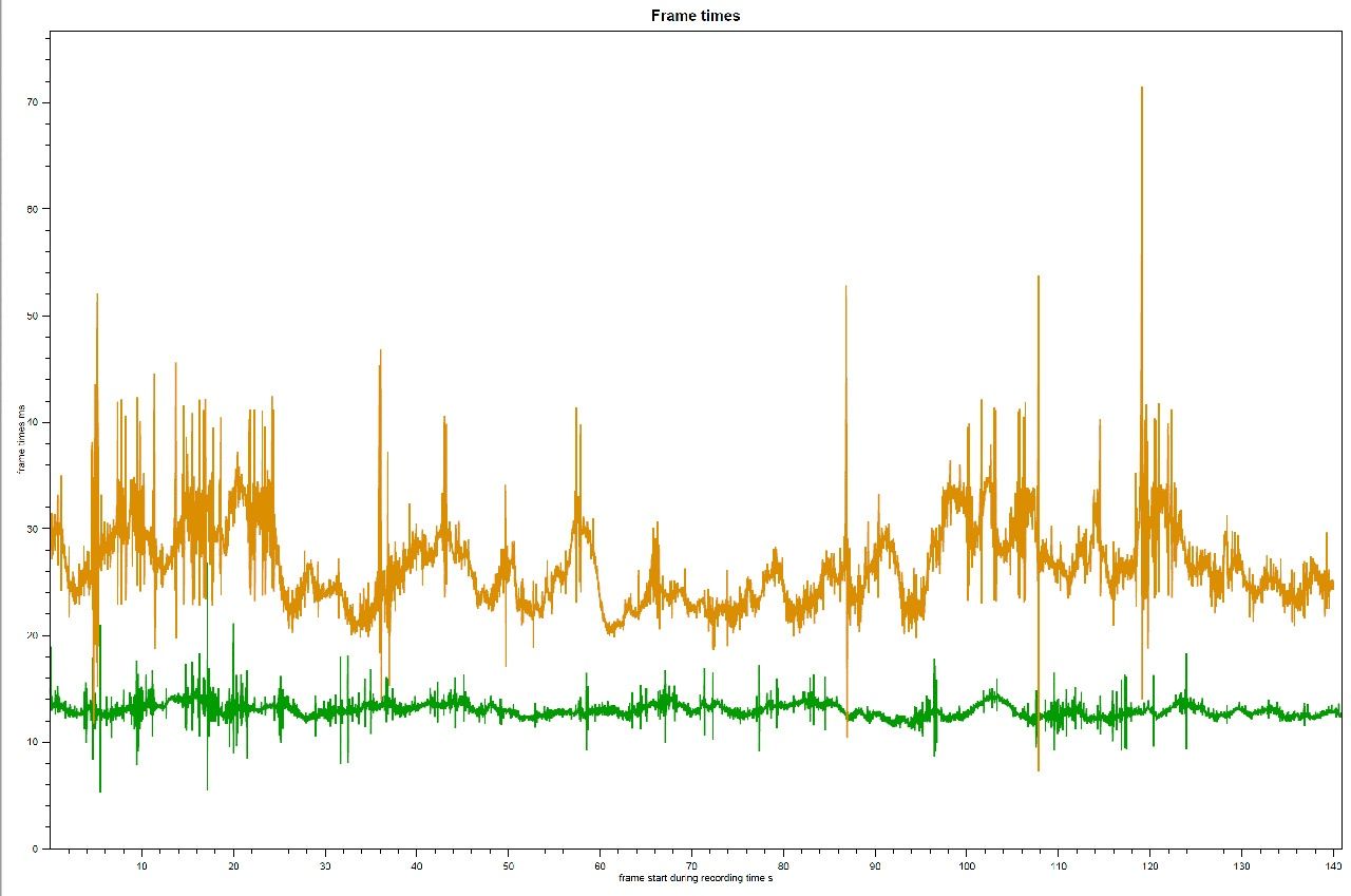 На этом графике отображены 2629 точек данных. Очевидно, что чем меньше время обработки кадров (ось Y), тем выше производительность. В лучшем случае получилось порядка 18 миллисекунд, что соответствует 56 кадрам в секунду. Затем этот показатель снижается до 26 мс (38 кадров в секунду) и держится плюс-минус стабильно на протяжении всего теста.