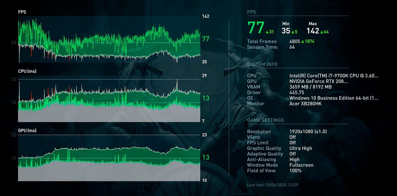 Более того, многие игры имеют встроенный бенчмарк. В той же Assassin's Creed Odyssey можно запустить встроенный тест, который проходит непосредственно в игровом мире, а затем отобразить результаты в подробном виде. Полученные данные о производительности и кадровой частоте можно сохранить, потом изменить настройки графики, прогнать тест ещё раз и сравнить с предыдущим. Как итог наглядные результаты, и легко понять, какое влияние оказали те или иные настройки.