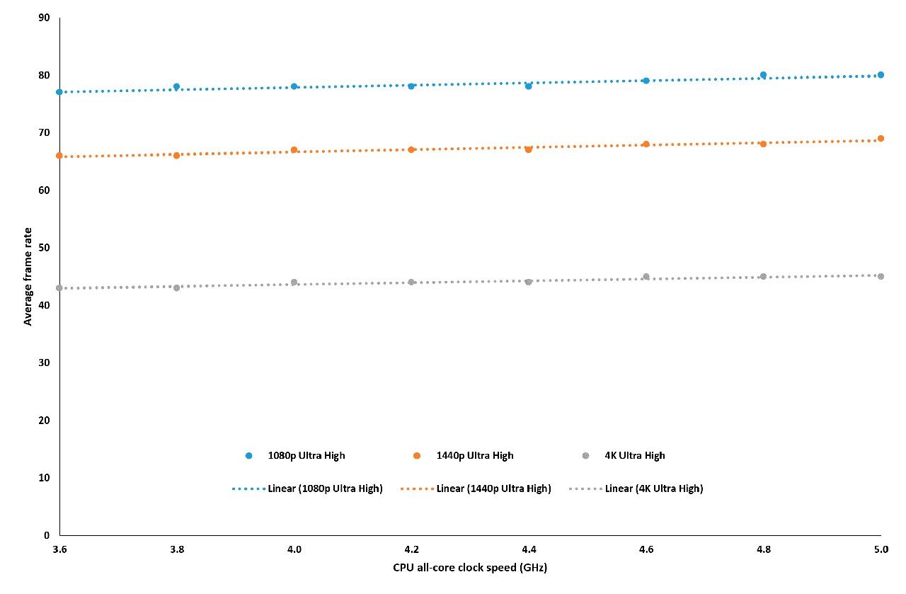 При разрешениях 1080p, 2К, 4К и ультра-настройках качества изменения частоты процессора в диапазоне от 3,6 до 5,0 ГГц практически не дали никакого эффекта. Здесь fps почти полностью зависит от видеокарты.