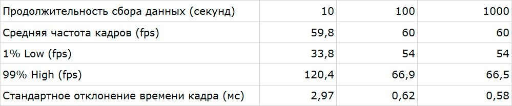 Кроме того, в ходе записи данных производительность может падать на долю секунды, когда система включает протоколирование и/или сохраняет собранную информацию. Это, очевидно, вызывает искусственные просадки fps, которых не будет при обычном игровом процессе, когда тесты не проводятся. А потому нахождение показателей 1% low fps и их исключение из общей статистики позволит игнорировать при анализе самые низкие значения. Это ещё больше приблизит к реальности итоговые результаты.