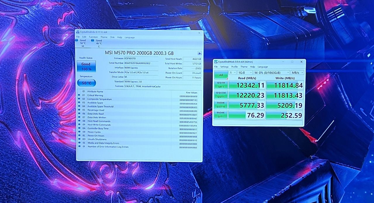 Абсолютно поголовно все они базируются на контроллере Phison E26, поэтому заявленные скорости работы у всех одинаковые: 12 ГБ/с при чтении, 10 ГБ/с при записи. Что любопытно, при реальной демонстрации работы на платформе AMD производительность ощутимо лучше. Да, сравнивался ноутбук и десктоп, но всё же.