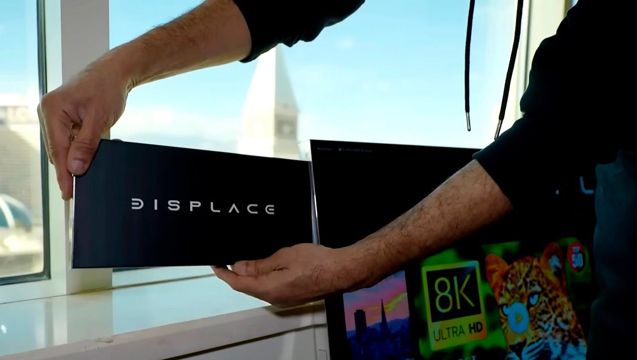 Второй экземпляр от Displace TV (конкретного названия нет) устроен иначе. Это 55-дюймовый телевизор с разрешением 4К, и тоже с отдельной док-станцией. Но в данном случае док-станция передаёт только сигнал, а питание обеспечивают встроенные батареи.