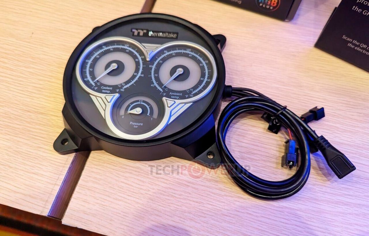 Thermaltake привезла Pacific TF3 – аналоговую «приборную панель» для СЖО-самосборок. Этот аксессуар предназначен для установки в посадочное место под обычный 120-мм пропеллер. В реальном времени стрелками показываются: температура внутри корпуса ПК, температура и давление хладагента в контуре.
