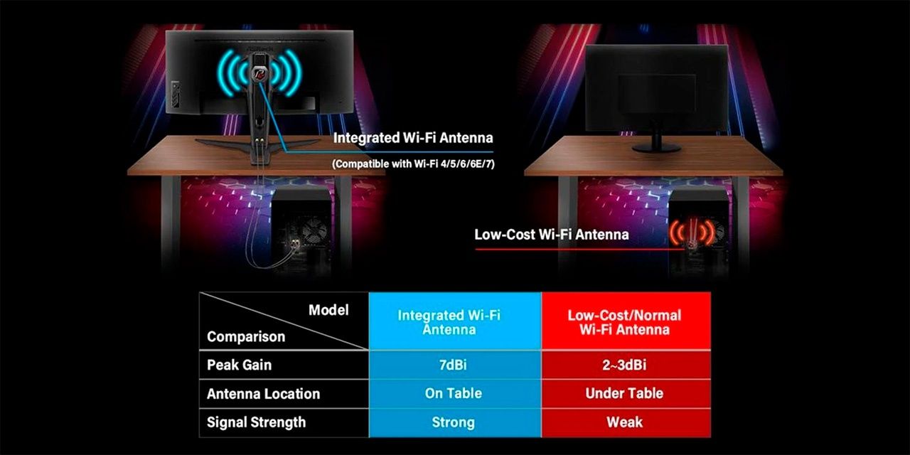 Ключевой особенностью почти всех мониторов линейки Phantom Gaming стоит назвать встроенный Wi-Fi. По мнению производителя, такой подход грамотный, ведь как правило монитор находится выше компьютера, и сигнал в этой области будет мощнее. Во-вторых, в корпусе монитора можно организовать приличные антенны. В общем, какое-то зерно истины в этом есть.