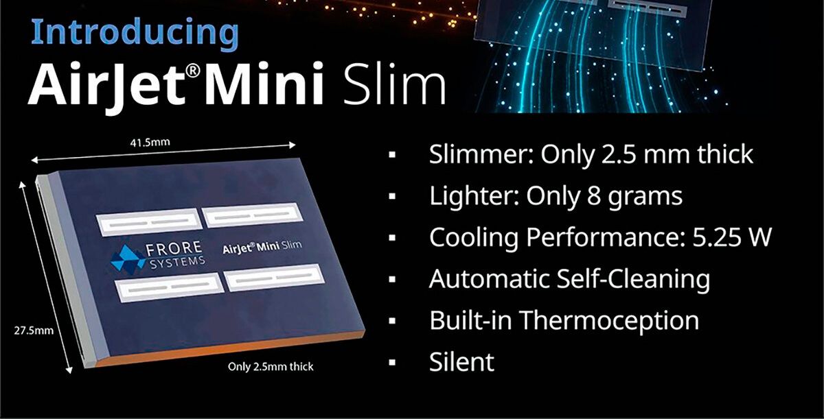 Frore Systems представила вторую версию ультразвукового кулера AirJet Mini. Она называется AirJet Mini Slim и может отвести 5,25 Вт тепла. С принципом работы можно ознакомиться в этой новости.