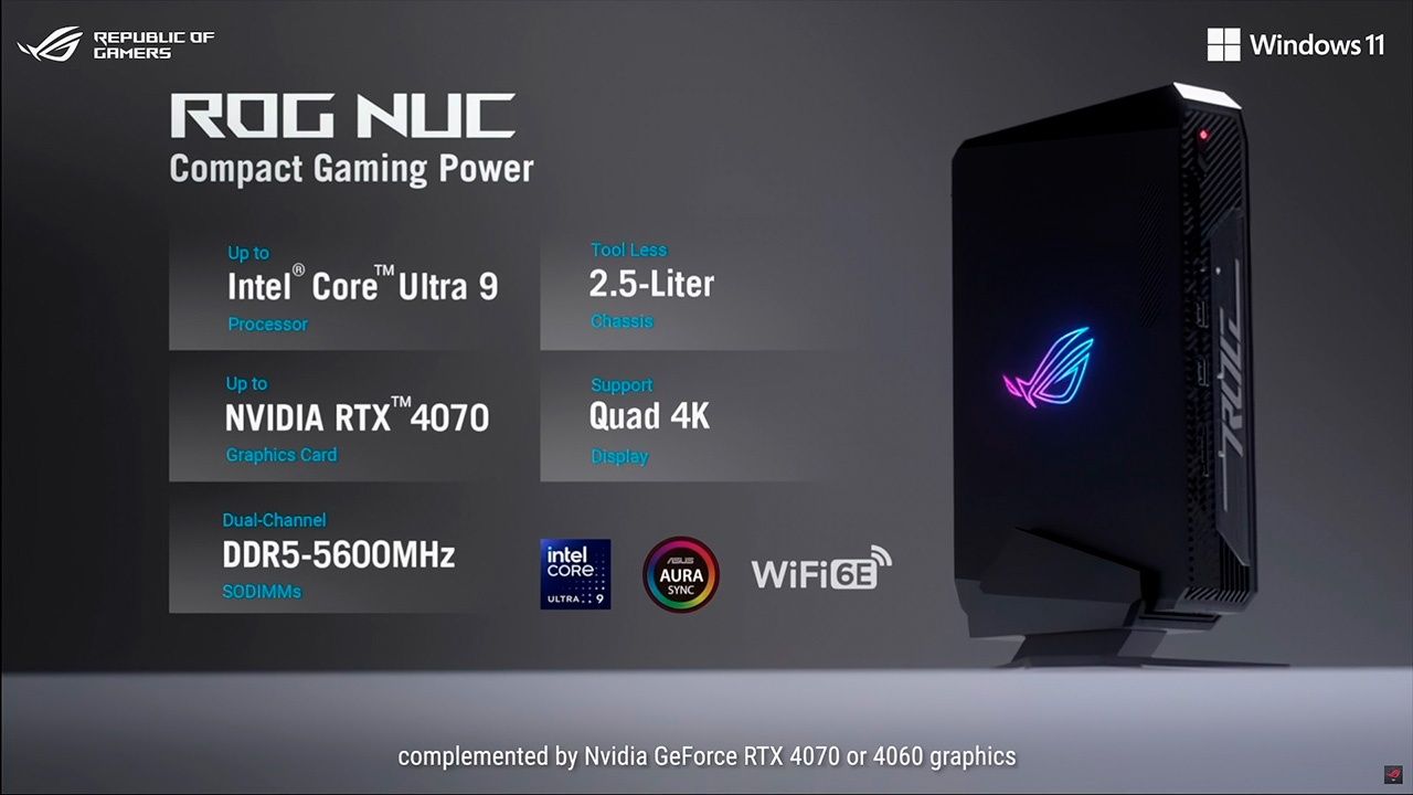 Технически интересен только NUC ROG – действительно «злой» мини-ПК с 16-ядерным процессором Core Ultra 9 и мобильной видеокартой RTX 4060 или RTX 4070, и всё это в корпусе объёмом 2,5 литра.