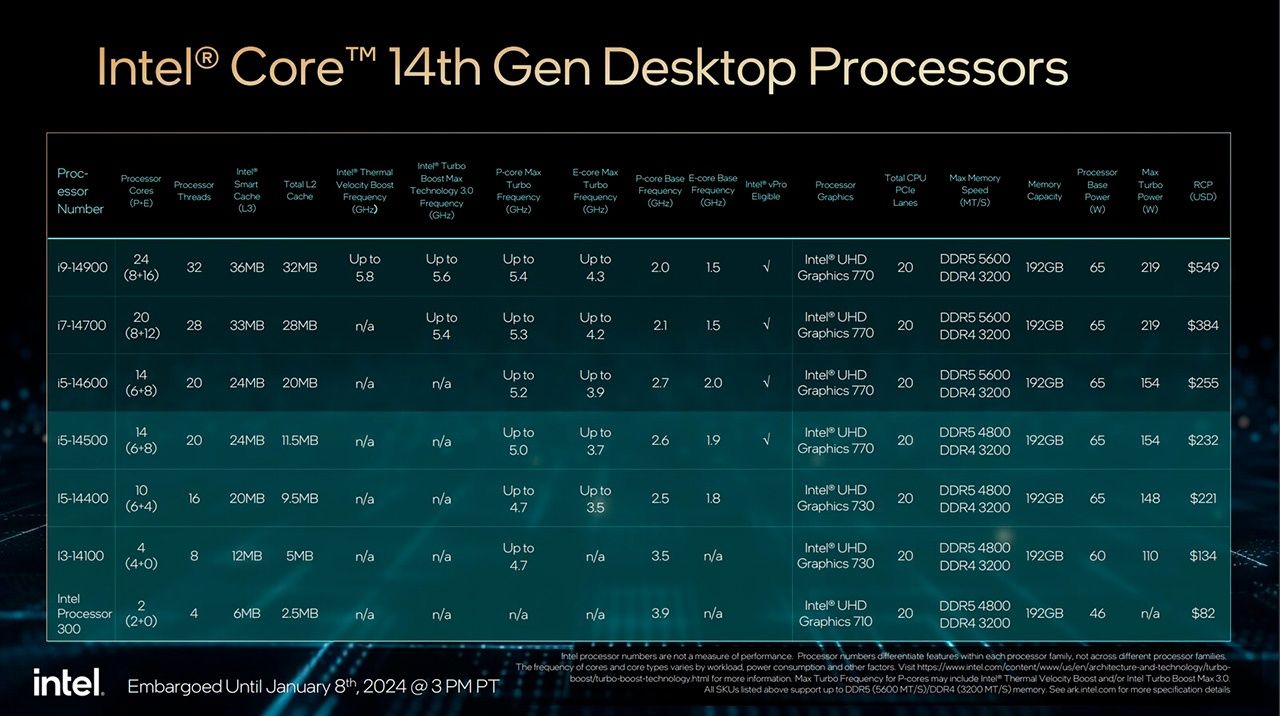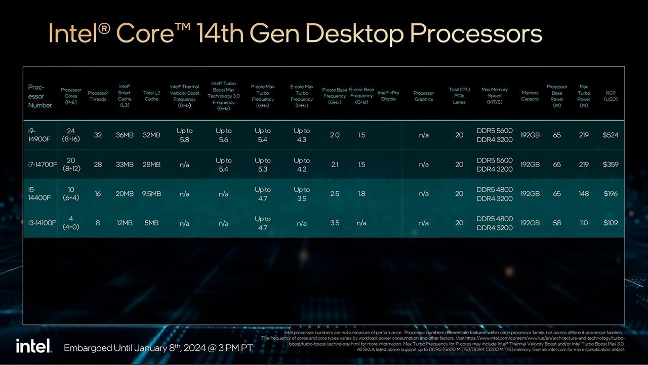 Intel представила процессоры Core 14-го поколения с заблокированным множителем. Кратко говоря, смотреть не на что. Это Core 13th Gen +200 МГц частоты, иногда +100 МГц. Выделяется только Core i7, где есть 4 дополнительных «маленьких» ядра.