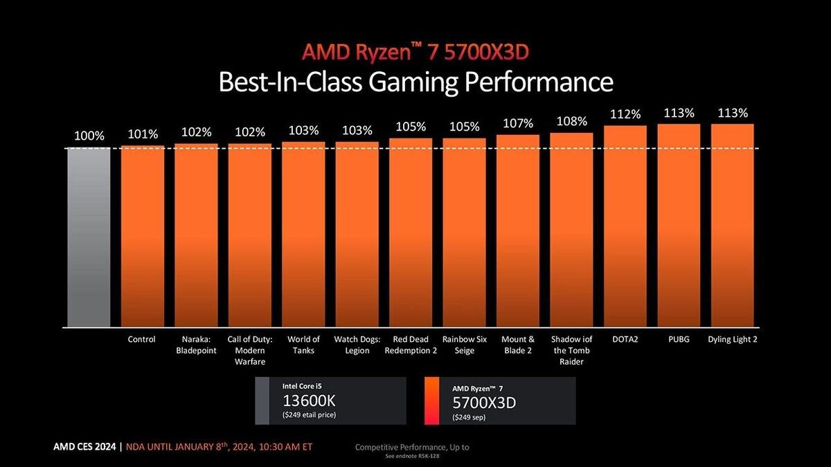 Есть 4 новинки, интересные все. Ryzen 7 5700X3D – отбраковка 5800X3D, которая не тянет высокие частоты. Всё тоже самое, но частота на 400 МГц меньше и 65-ваттный лимит мощности. В качестве конкурента AMD видит Core i5-13600K.