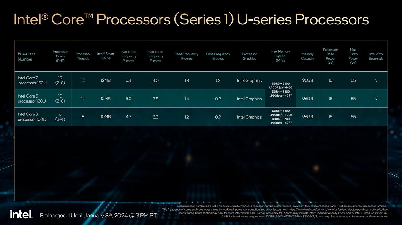 Особенно удивляет сверхэффективная U-серия. Обратите внимание на маркировку в предыдущем слайде и этом. Они теперь реально маркируют чипы как «Intel Core 7 processor 150U» и «Intel Core 5 processor 120U». Едва месяц прошёл с того момента, как Intel подкалывала AMD за нюансы с маркировкой, а теперь вот это. Припоминая поговорку, советуем Intel снять крестик.