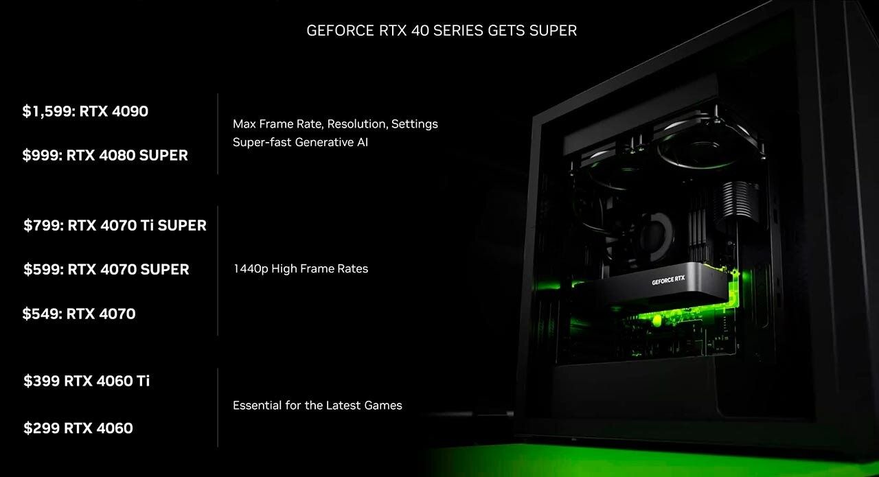 GeForce RTX 4080 Super, RTX 4070 Ti Super и RTX 4070 Super поступят в продажу в течении января. Оригинальные RTX 4080 и RTX 4070 Ti уходят с рынка, а младшая модель получила 50-долларовую скидку. Кому она будет нужна на фоне сильно более интересной Super-версии с доплатой в полтинник – вопрос открытый.