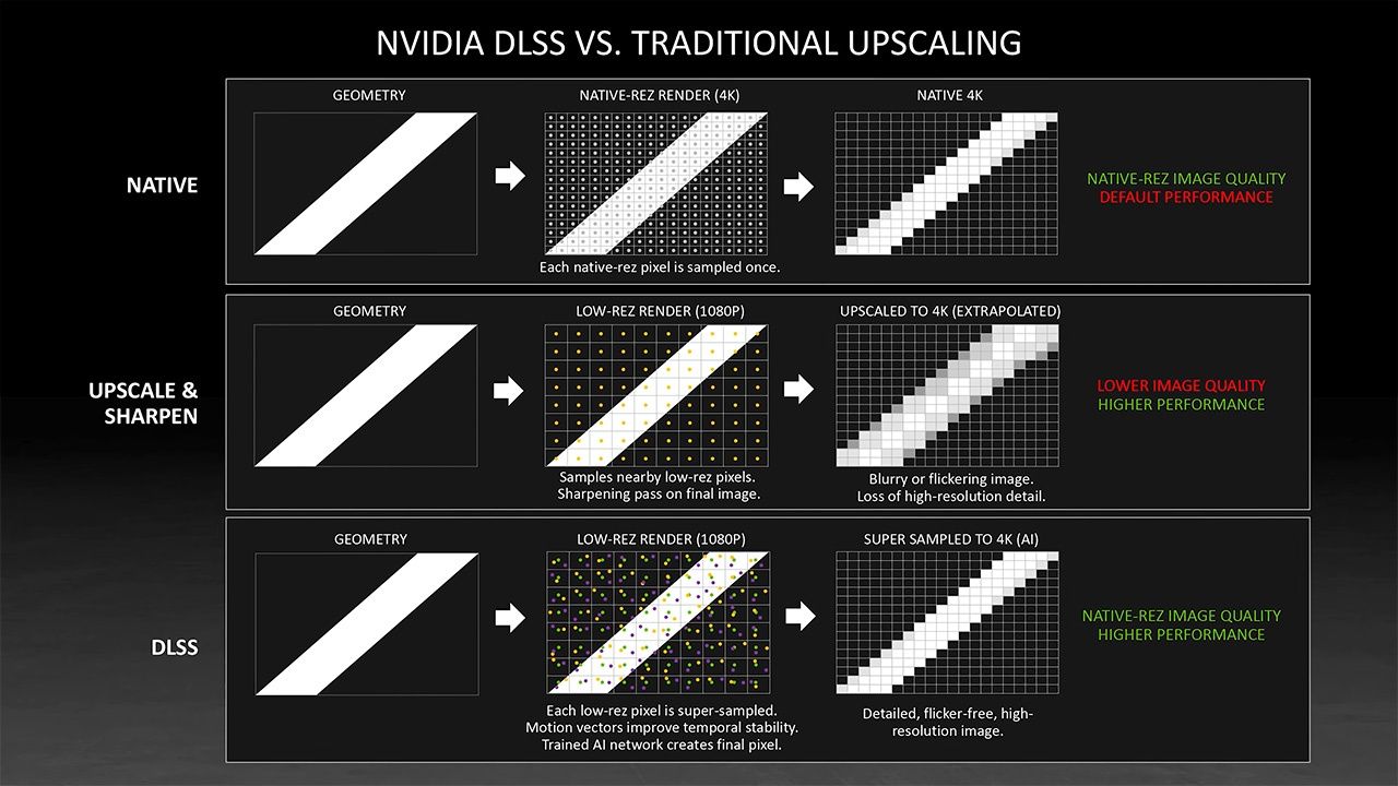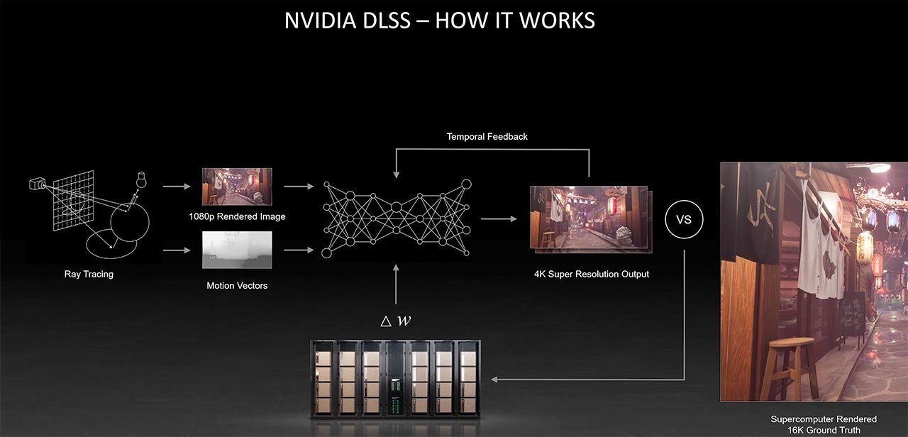 DLSS: нейросеть учитывает информацию из предыдущих кадров. Воссоздаёт объекты и детали с высокой точностью. Иногда лучше нативного.