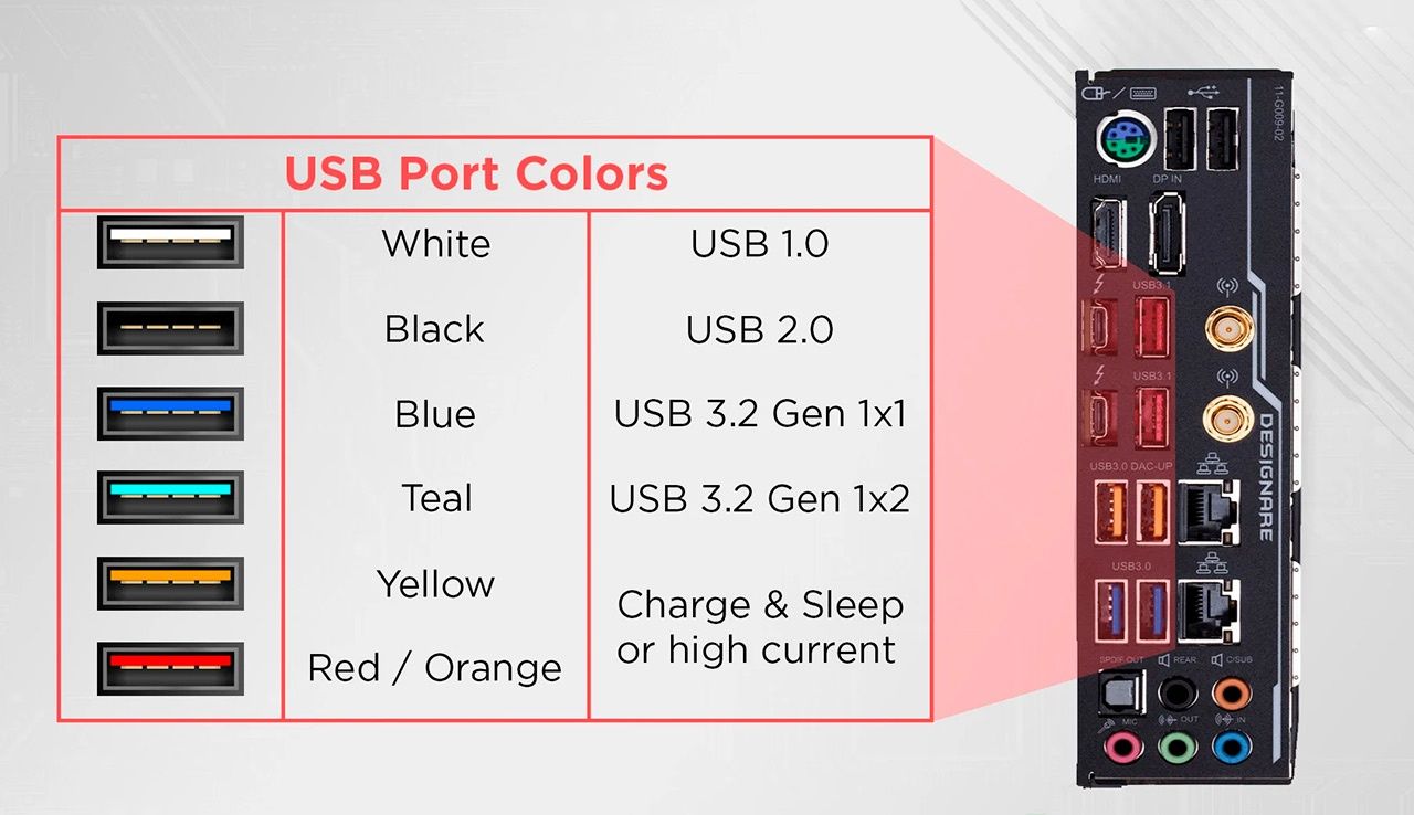 - Голубой – USB 3.2 Gen 1x2 (USB 3.1);