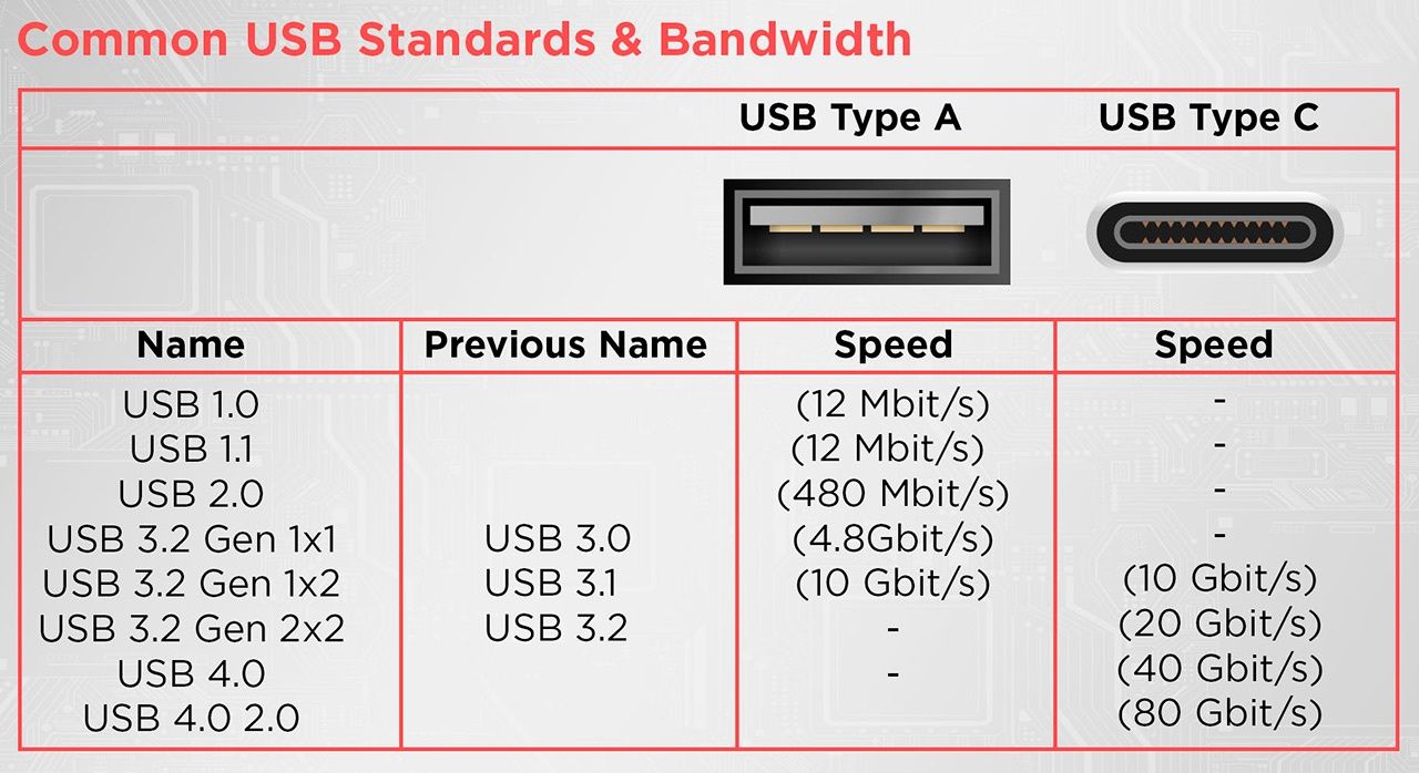 - USB 4 2.0 – стандарт утверждён, но «в железе» пока не воплощён. 80 Гбит/с.