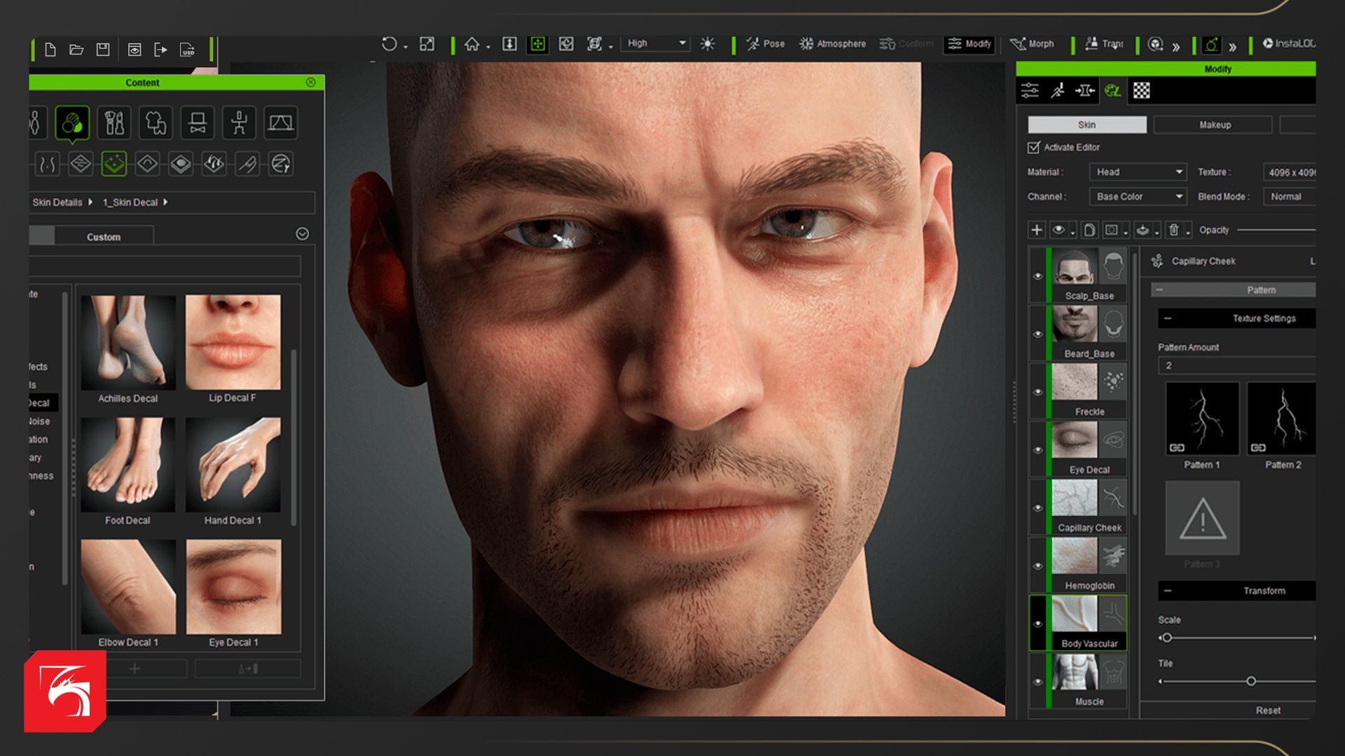 Встроенная технология Skingen позволяет легко добавлять и настраивать текстуры с высокой степенью детализации. Программа использует UDIM-текстуры*, которые совместимы со всеми редакторами. Например, Character Creator отлично работает в связке с Substance Painter. Обе программы отлично дополняют друг друга.