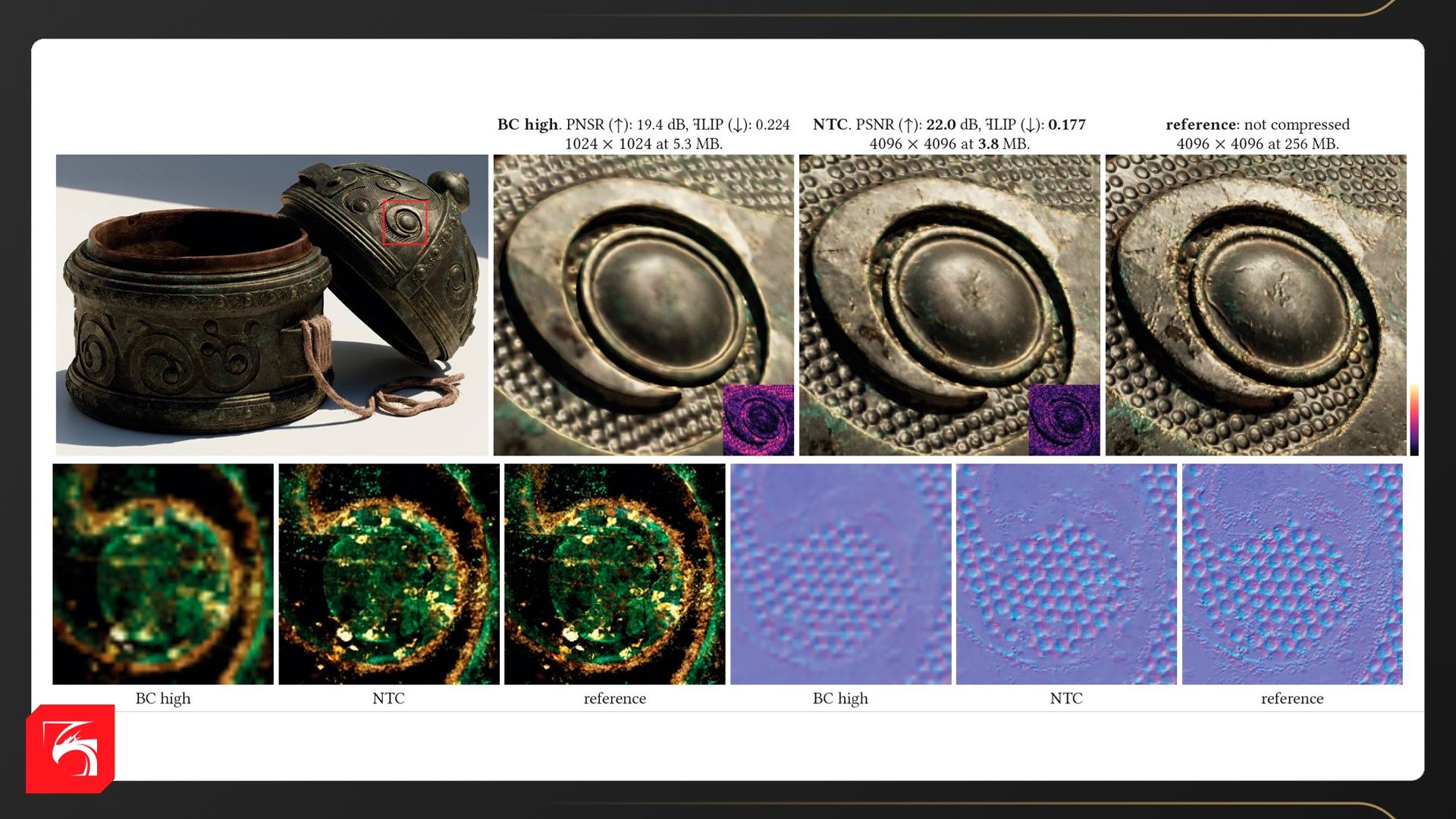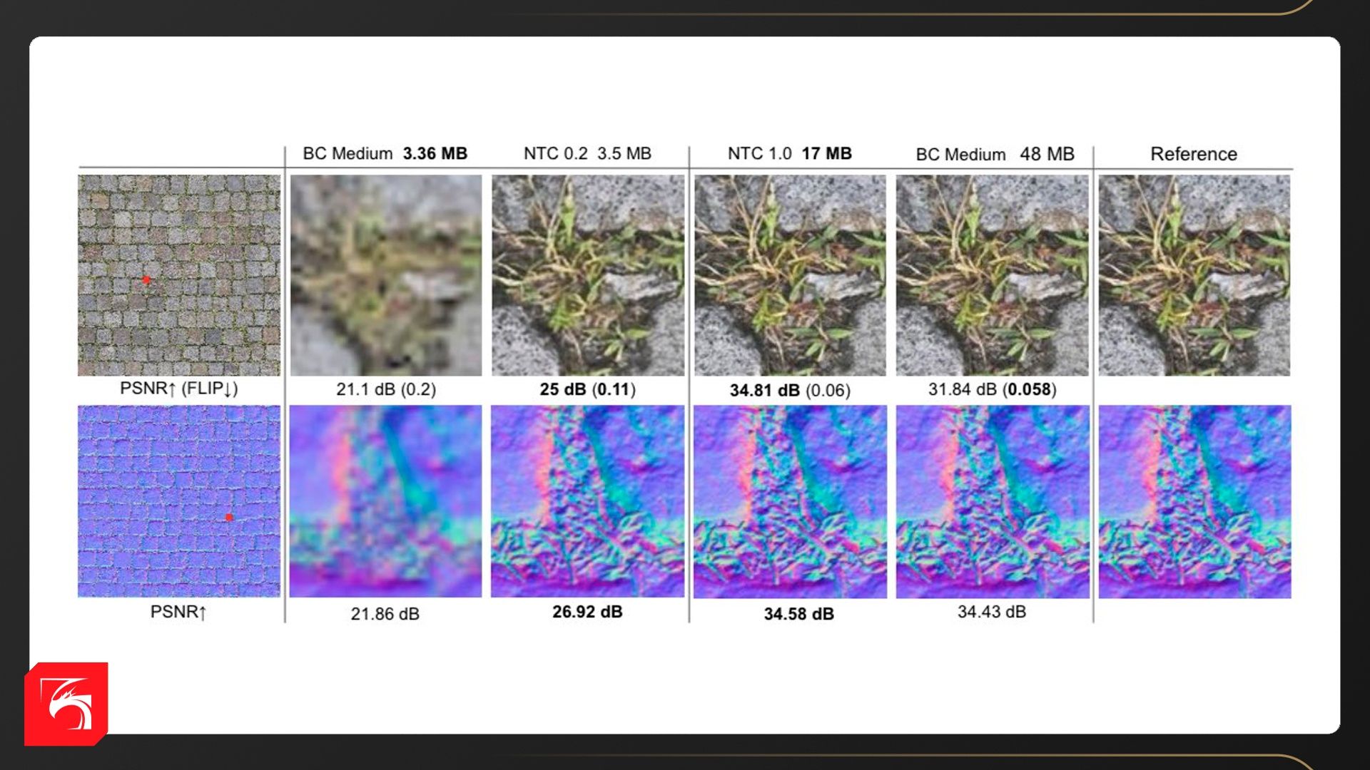Всё чаще появляются новые методы сжатия. Например, Neural Texture Compression (NTC) от NVIDIA, который использует нейронные сети для сжатия. Такой подход обеспечивает более высокую детализацию при аналогичных требованиях к памяти по сравнению с традиционными методами.