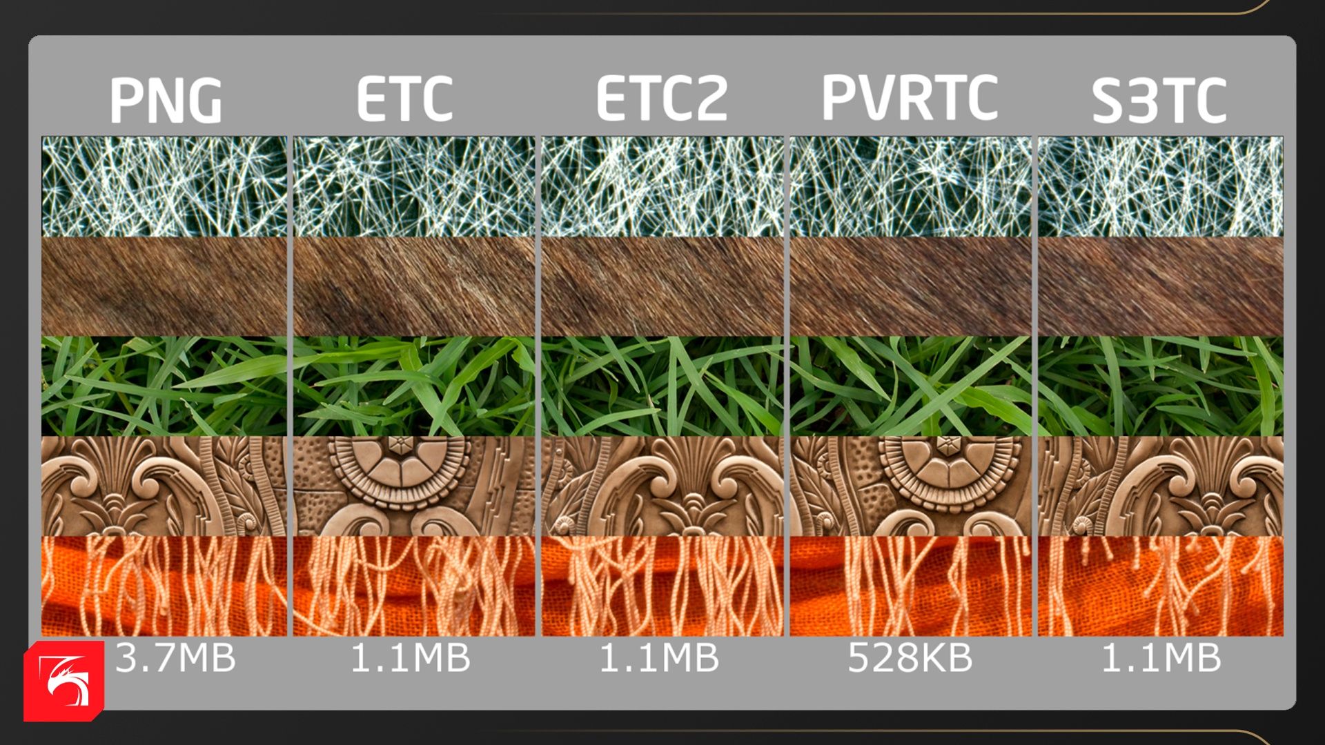 Для дополнительной оптимизации используются методы сжатия текстур: S3TC (S3 Texture Compression), PVRTC (PowerVR Texture Compression) и ASTC (Adaptive Scalable Texture Compression) и другие. Они сохраняют высокое качество изображения при меньших ресурсах.