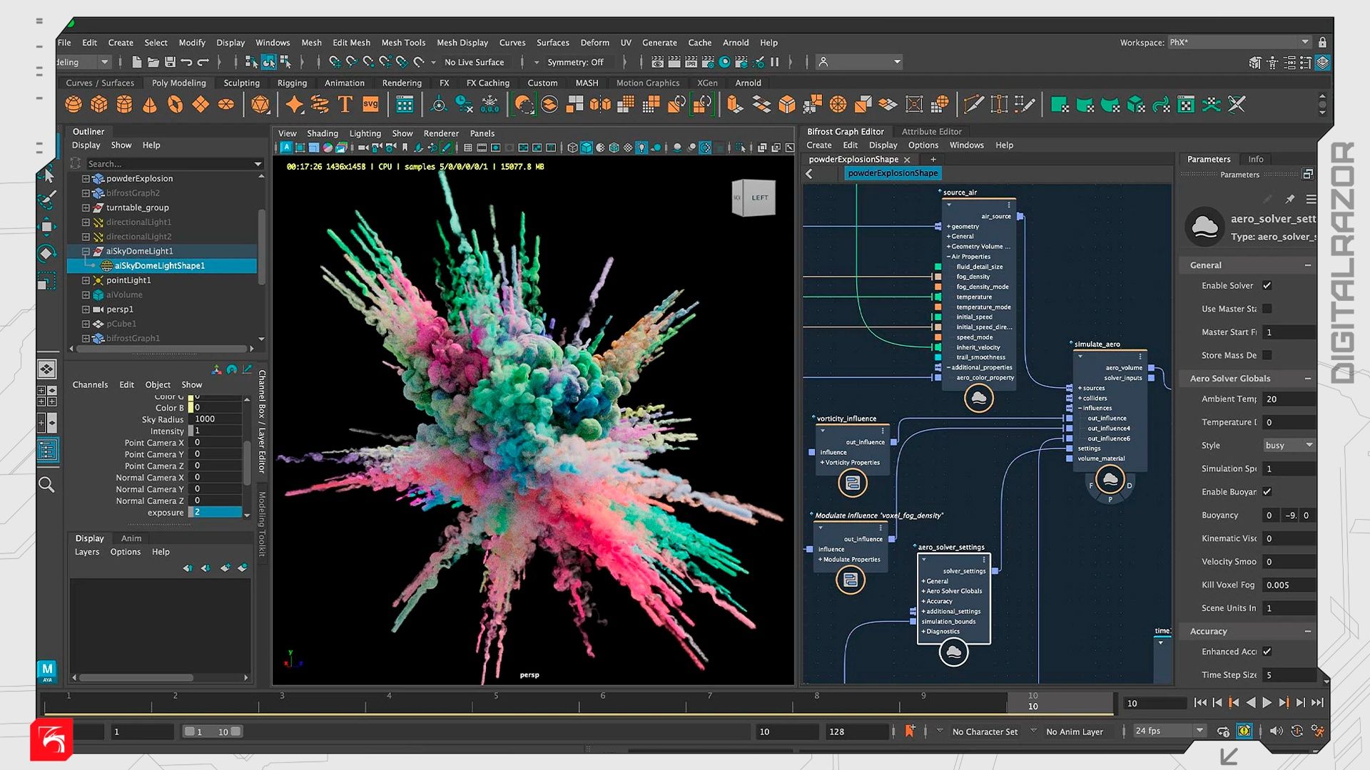 В Maya встроены мощные плагины и инструменты для создания симуляций:Bifrost. Предназначен для визуализации жидкостей, газов, твердых тел и тканей с высокой степенью детализации. Используется для сложных симуляций воды, дыма и разрушений. Этот инструмент способен обрабатывать сцены с огромным количеством элементов.