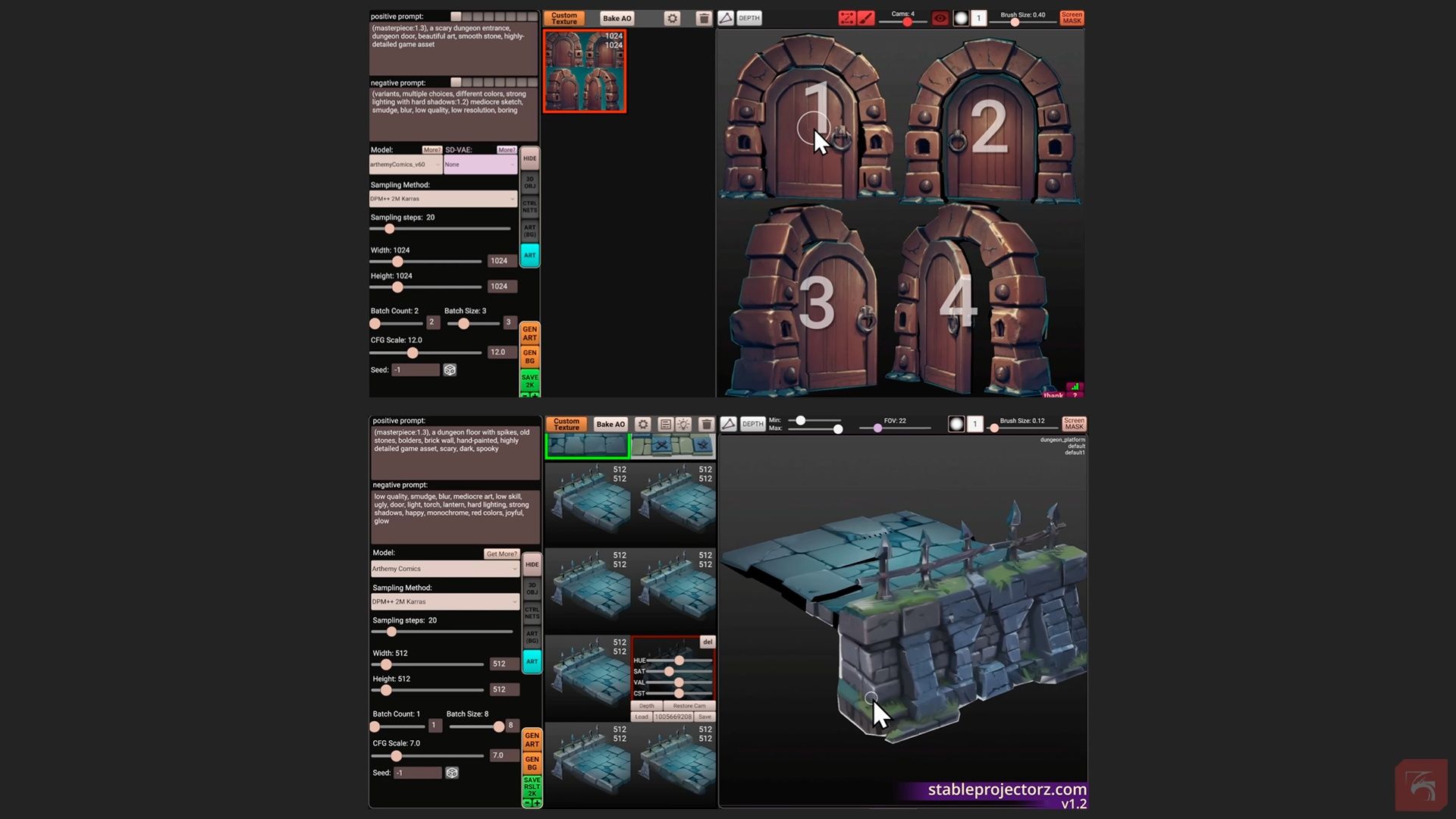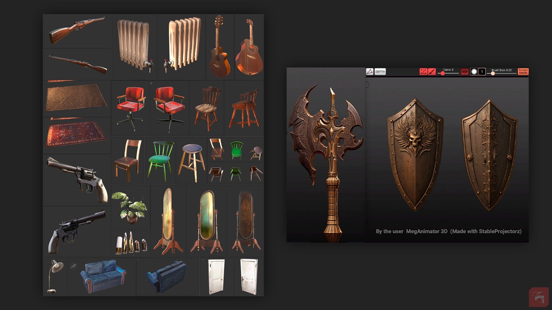 За несколько минут мы получили результат приличного качества. Если бы художник рисовал модель от руки, затем подбирал текстуры и натягивал их на объект, у него бы на это ушло несколько часов.Stable Projectorz: генерирует текстуры и материалы.
