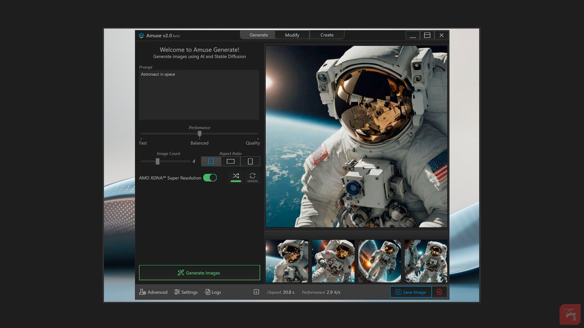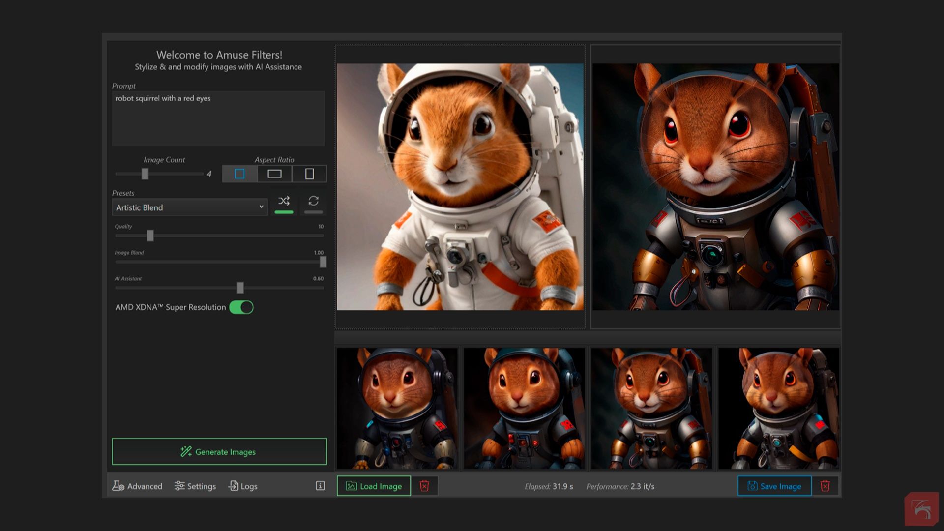 Интерфейс интуитивно понятен, поэтому не нужно обращаться к командной строке или изучать сложные настройки. Кроме того, Amuse 2.0 имеет встроенный апскейлер AMD XDNA Super Resolution, который ускоряет процесс вывода изображений и при необходимости увеличивает их разрешение в два раза.