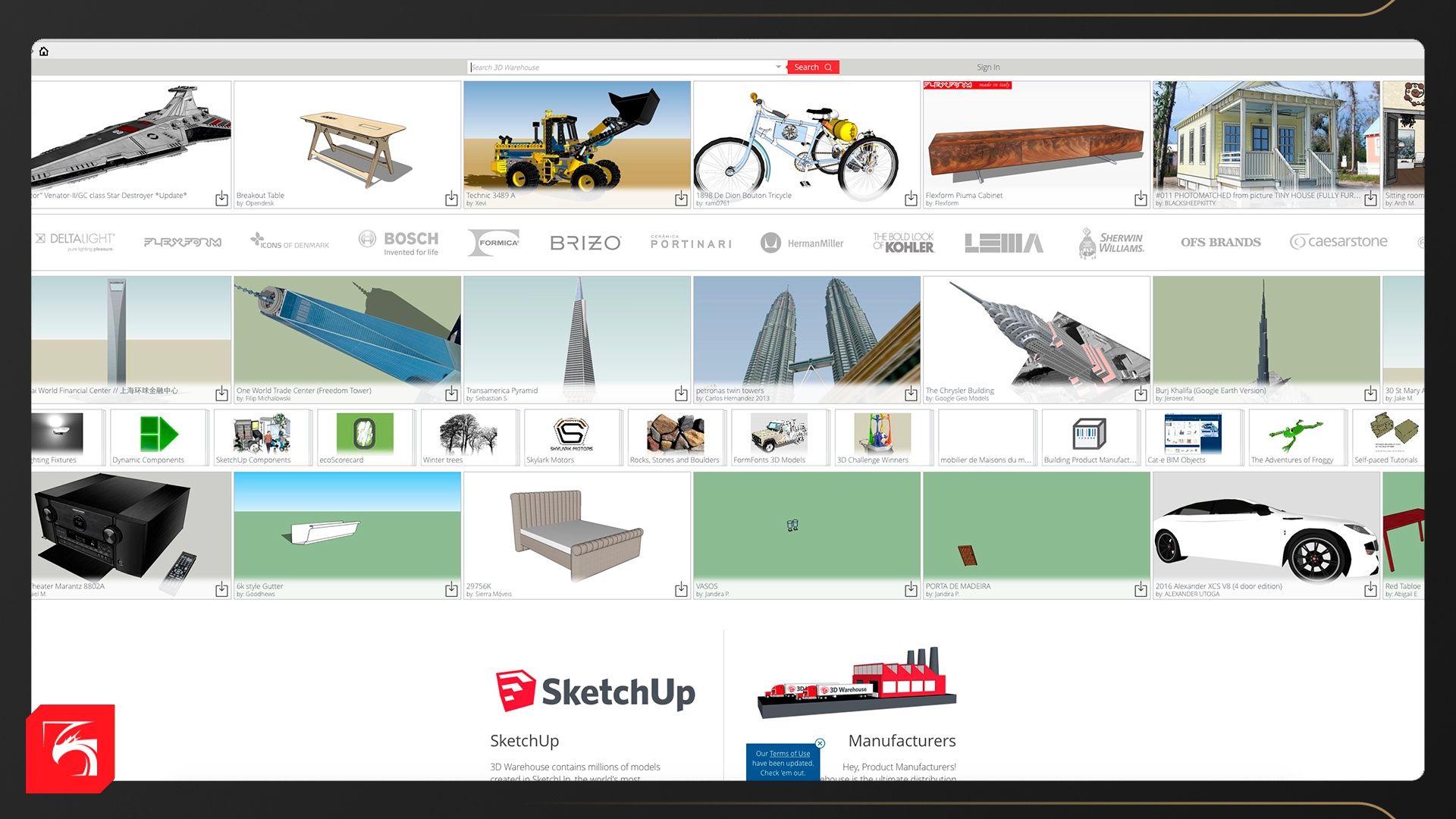Одной из уникальных возможностей SketchUp является доступ к библиотеке 3D Warehouse, куда пользователи могут загружать готовые модели. В этой библиотеке можно найти тысячи объектов: мебель, декор, двери, окна и даже готовые здания. Это экономит время, которое архитектор тратит на мелкие детали, и позволяет сосредоточиться на общей концепции проекта и других важных вопросах.