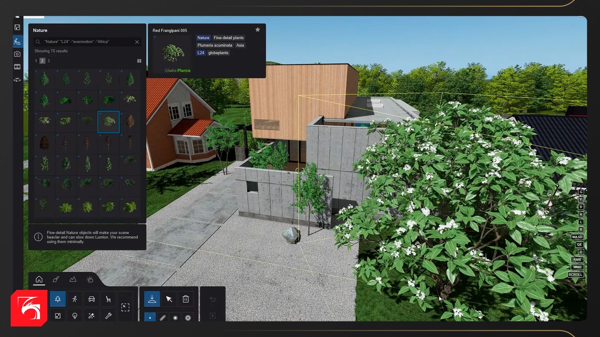 Главные преимущества Lumion — интуитивно понятный интерфейс, наличие библиотеки готовых ассетов, быстрый рендеринг и удобная работа с материалами. Вместо долгих настроек, как в 3ds Max, здесь достаточно перетащить нужные объекты в сцену, выбрать параметры и настроить освещение.